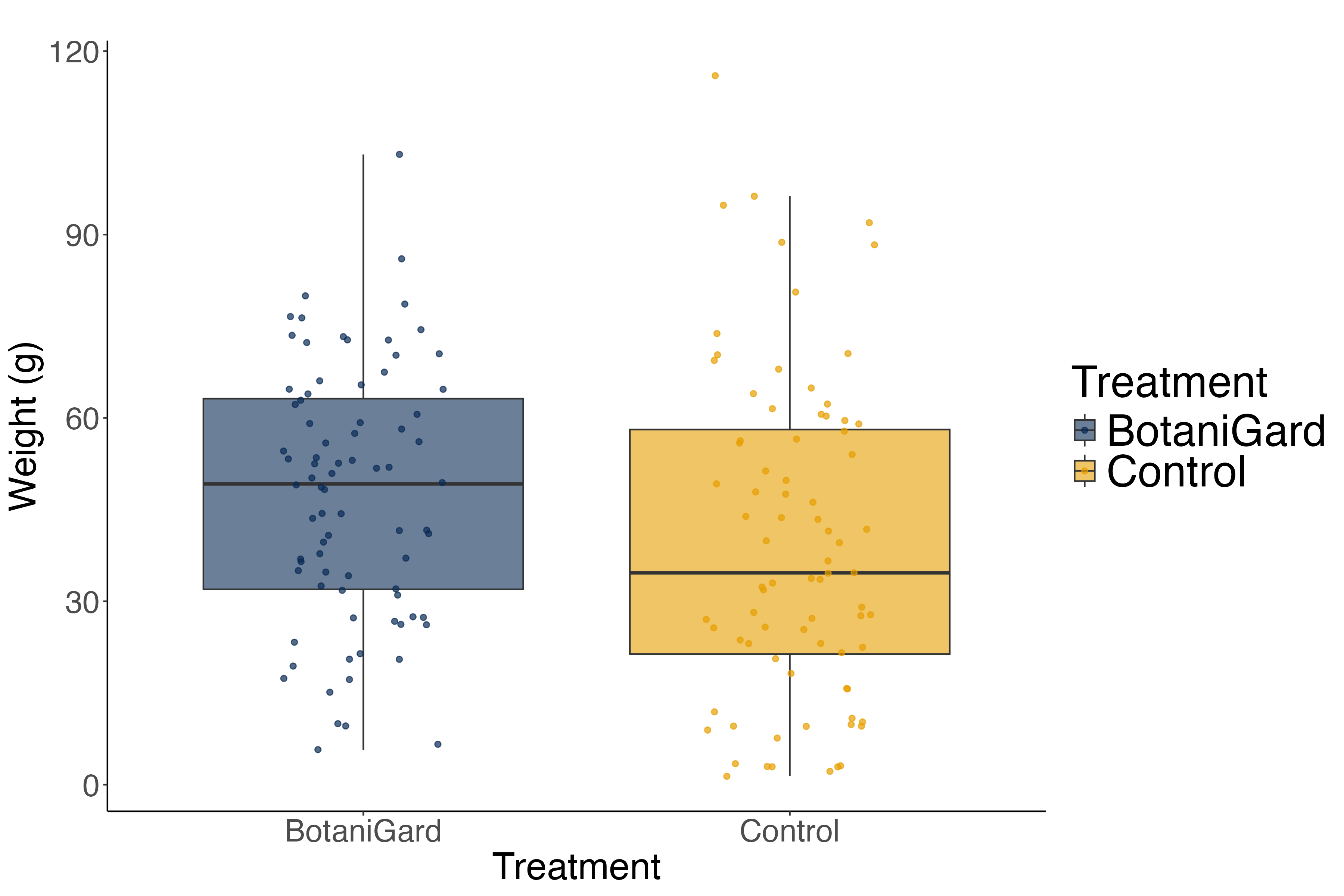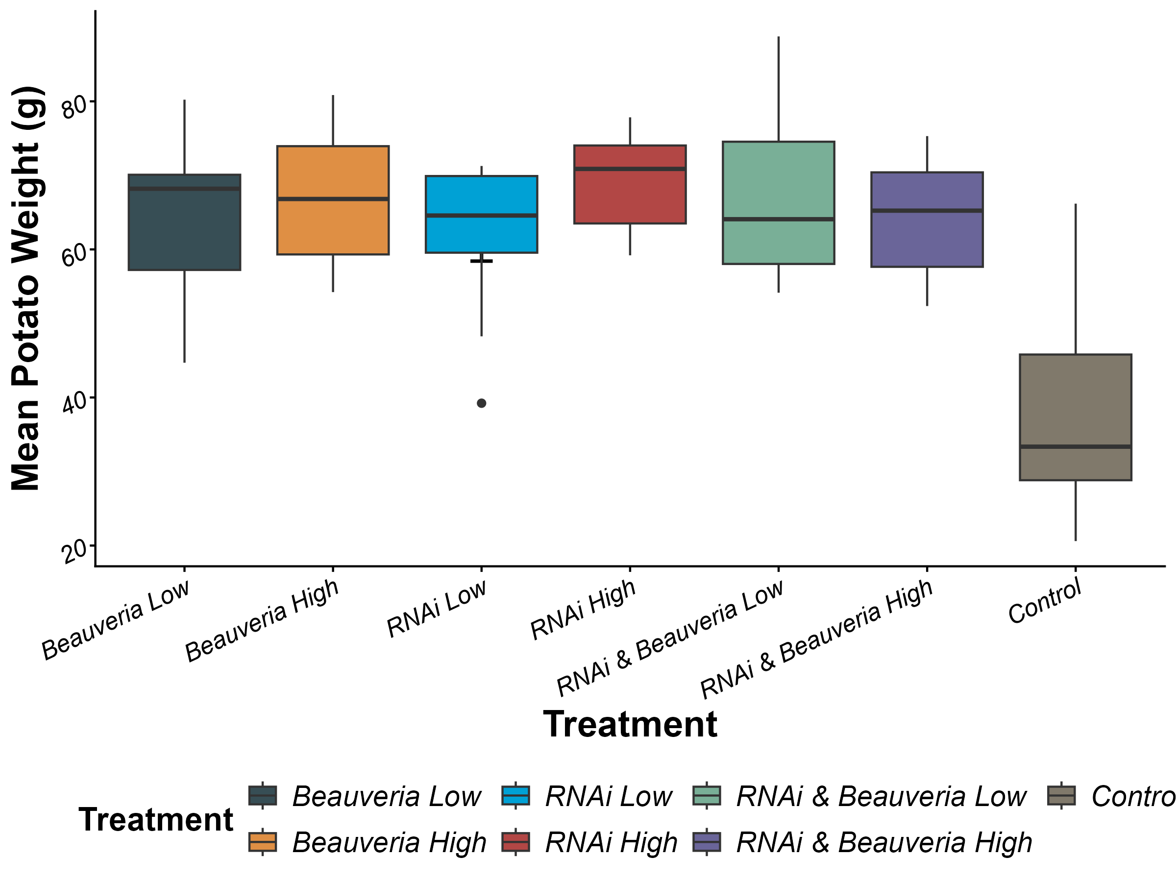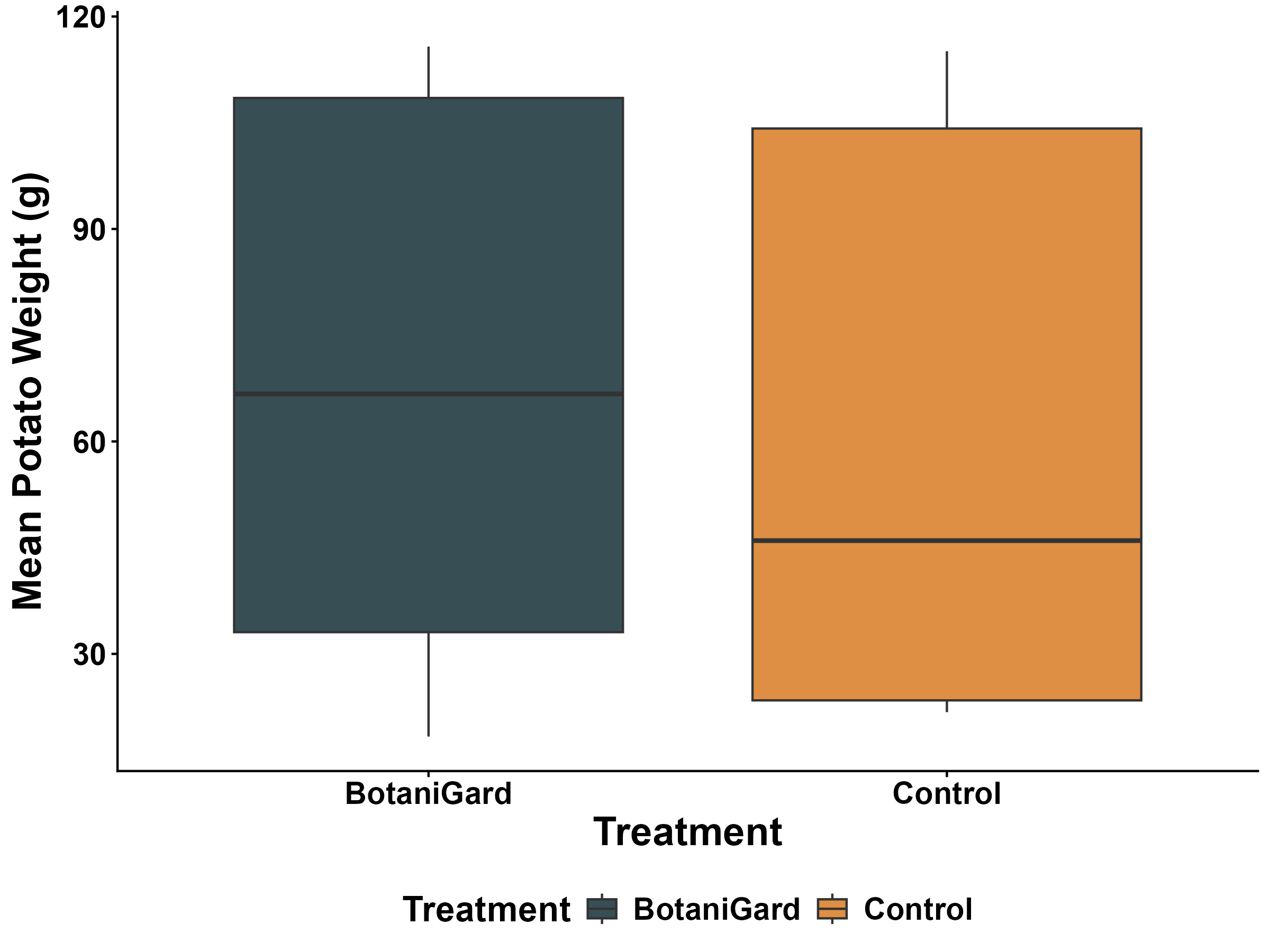Figure 3. Mean tuber weight per plot for control and BotaniGard treatments. Boxplots show the distribution of plot-level mean weights.