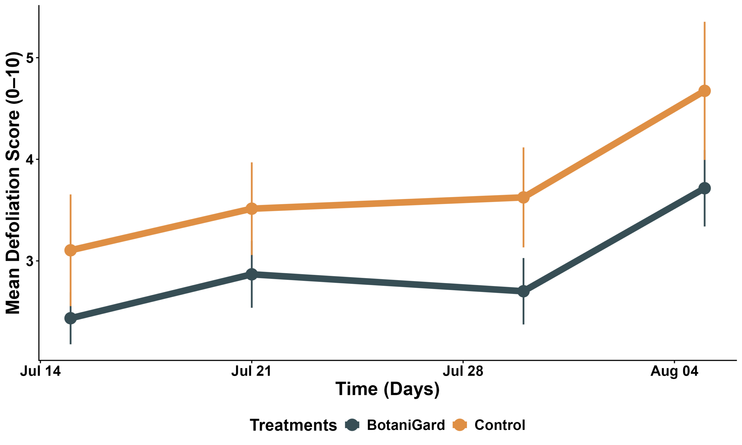 Figure 2. Mean defoliation scores (0–10 scale) across sampling dates in control and BotaniGard plots.