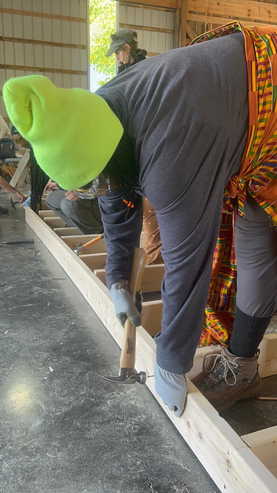 Apprentices also attended one agriculture-related training and/or class of their choice each month, and reported back to the group about what they learned at their class in the weekly farm team meeting. These debriefs served to share knowledge gained from each class with the larger group. It helped to provide insights about what each apprentices had learned during their classes and how that knowledge aligned with their ILP. By far the most popular training apprentices attended was a 3 day-long carpentry and building workshop hosted by Craftwell School in Brandywine, MD, in October 2025. During the year, apprentices had the chance to use basic power tools (drills, impact drivers, jigsaws, circular saws) for small repairs and projects (most notably, cutting a hole in the side of one of the shipping containers we use as a walk-in cooler, and building a wooden support for the large AC unit we use to cool it), but expressed a strong interest in a more immersive carpentry and tool training. Thankfully, the amazing team over at Craftwell put on a workshop to teach beginners just that -- and apprentices had the opportunity to learn and network with other beginning farmers and builders in our area. Craftwell also intentionally builds spaces for students, which was appreciated by our apprentice team. The success of this training has led ECO staff to consider building in a dedicated construction and basic building tools component to future apprenticeship programs.