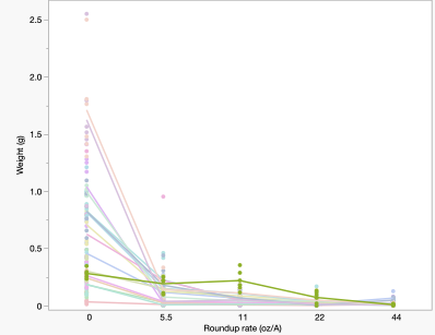 Our results are graphed above. None of the populations showed clearcut resistance to glyphosate. One population was borderline – the common lamsquarters population from Farm ID 8 highlighted in green – which was able to survive a low (~0.5x) rate.