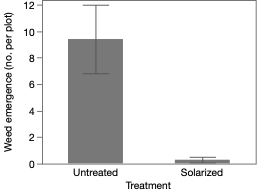 Unsolarized flats were set out adjacently without impermeable trays, as well as 4 flats of sterile potting mix used to account for blown-in seed. Temperature loggers were placed under the solarization plastic between flats, but not in sunlight. June 4 was our warmest, sunny day and temperatures at these locations remained above 110 degrees F, reaching a maximum of 119 degrees. On June 5, solarization plastic was removed, flats were separated at least 6" to prevent soil movement during rainfall. At this time, no emerged weeds were present in either treatment.
