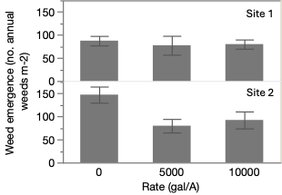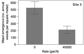 The most abundant weed species were common ragweed and several annual grasses. For the purposes of this study, perennial weeds were ignored since they were likely sprouting from root fragments rather than seeds. There was no effect of boiling water at site 1 and only a modest effect at site 2, with no improvement at the highest rate.