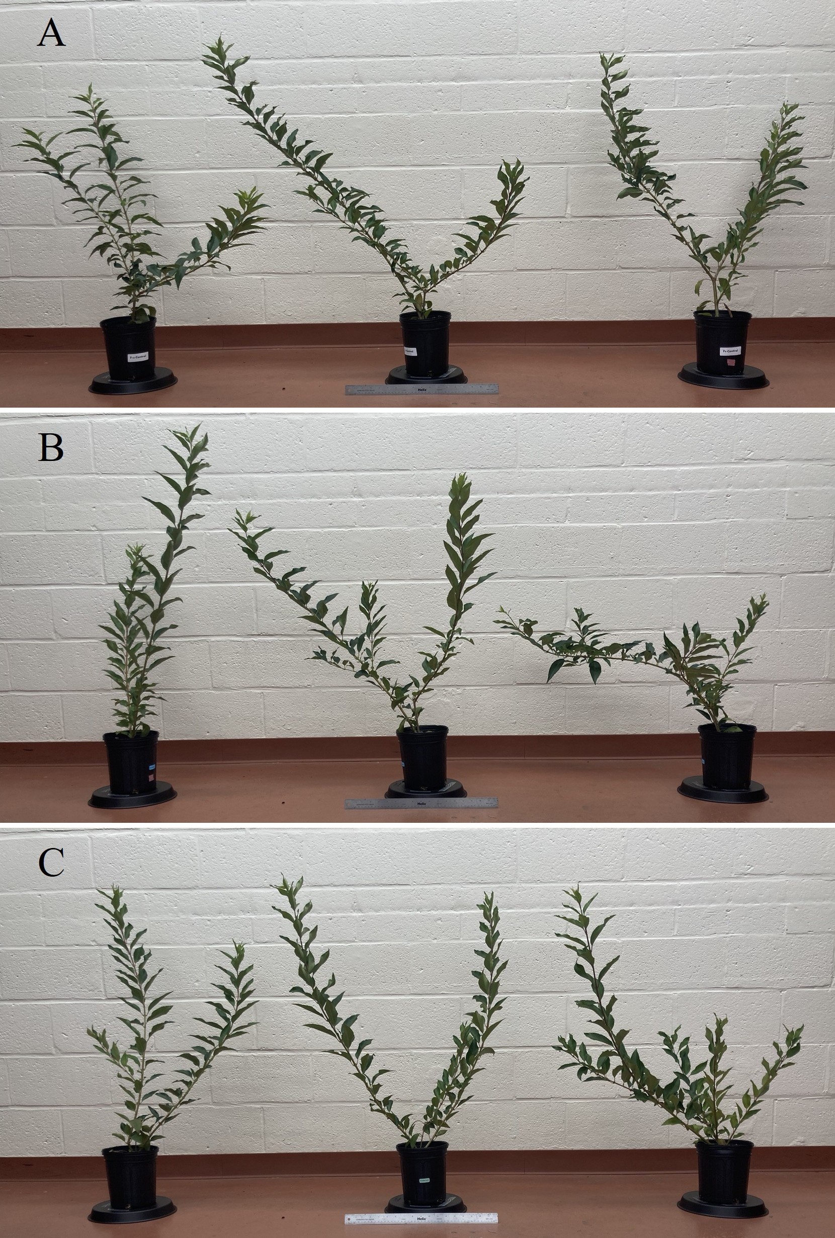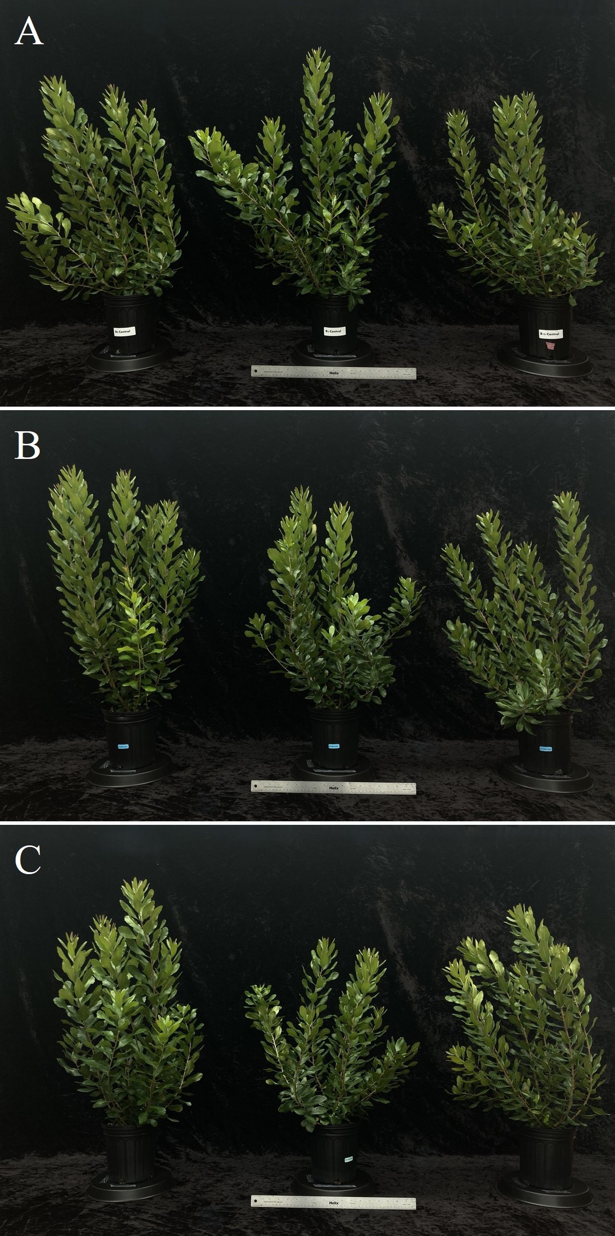 For study 1, species were propagated in house during late winter to early spring 2024 from stem cuttings or tissue culture micropropagation. In mid May rooted cuttings of Forsythia and Northern Bayberry were transplanted into #2 trade containers and Microbiota into #1 trade containers. Plants were top-dressed with the manufacturer’s recommended low rate of controlled release fertilizer (15-9-12 Osmocote Plus 5 to 6-month formulation). Plants were grown and evaluated for 12 weeks. Each species was arranged as a separate CRD.