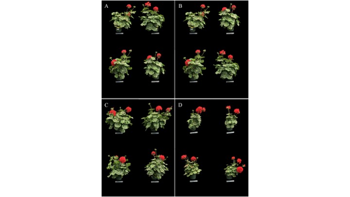 For study 3, four week old Geranium seedlings were potted into 6.5-inch azalea containers and top-dressed with the manufacturer’s recommended low rate of controlled release fertilizer (15-9-12 Osmocote Plus 3 to 4-month formulation). Plants were fertigated with a 13-2-13 formulation at 250 ppm N for the first 4 weeks and at 125 ppm N for the rest of the study. Plants were grown and evaluated for 10 weeks.
