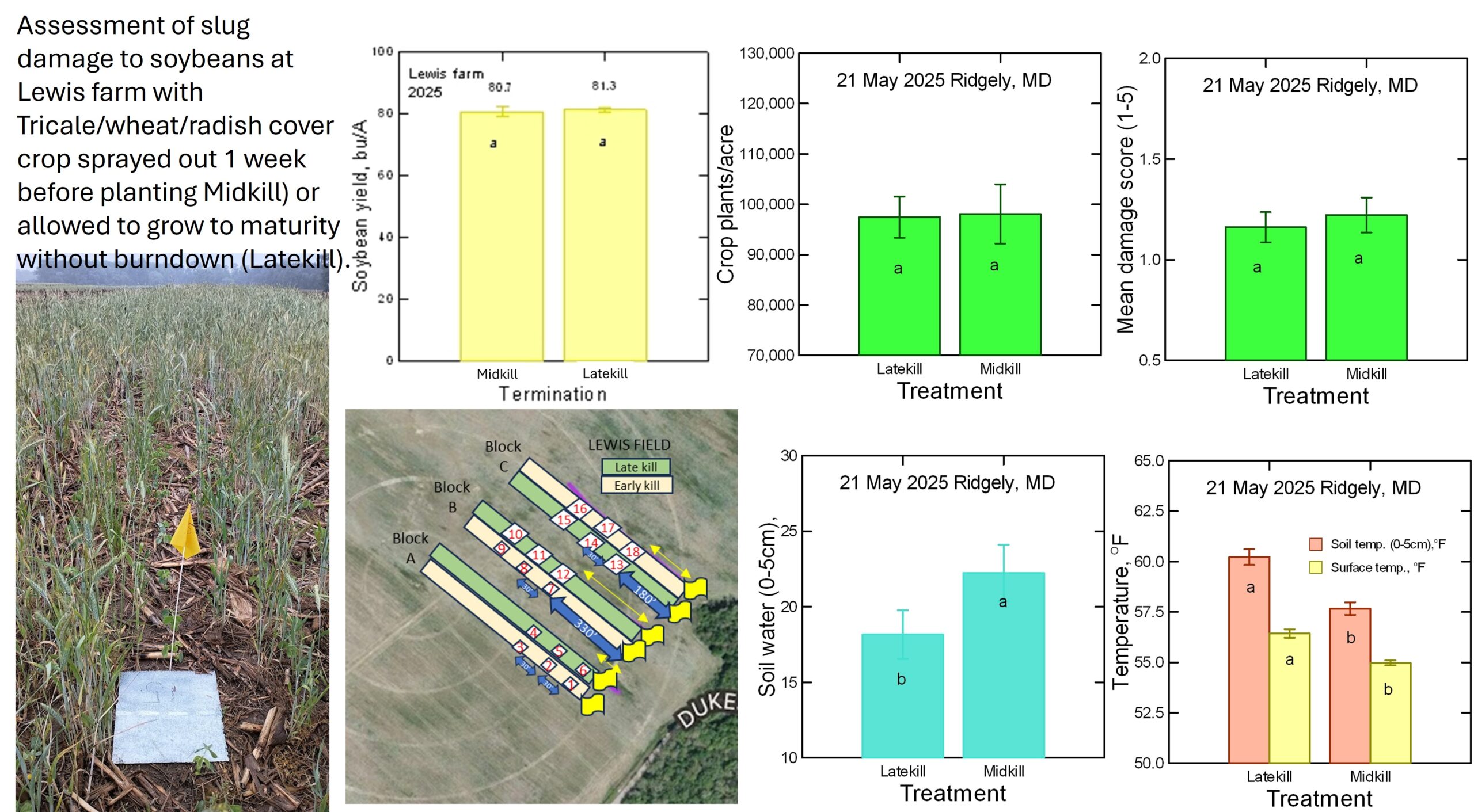 Jim Lewis’ farm is located at 38°58.1303'N 75°50.7748'W in Ridgely, MD. Dominant soil series present according to USDA WSS are “Hambrook loam, 0 to 2 percent slopes”, “Ingleside sandy loam, 2 to 5 percent slopes”, and “Hambrook sandy loam, 0 to 2 percent slopes.” The Lewis farm grows primarily a soybean/corn rotation under no-till management and has used cover crop for more than 20 years. Two treatments of cover crop termination timings were established following harvest of soybean and corn in fall 2023. Different cover crop species were used depending on the preceding cash crop. Following soybean and preceding corn, vetch and radish were planted. Following corn and preceding soybean, radish and winter wheat were planted. In most of the field the co er crop was terminated on April 25, 2024 (early termination) while four replicated strips, each approximately 10m wide, and 700m in length were on May 8-10 2024 at the same time as corn or soybean planting (planting green). The planted green strips each had a similar 10 m wide strip of early-terminated cover crop between them. The corn and soybean were planted in adjacent fields equipped for center pivot irrigation. Slug counts and crop seedling damage ratings plus ancillary soil temperature and moisture measurements were made between mid-April and mid-May 2024. To facilitate slug counts, three shingle-traps were placed in each treatment strip. Crop stand counts were performed several times, corn V6 stage plant weights were determined in June and the farmer measured the final crop yields in October 2024.