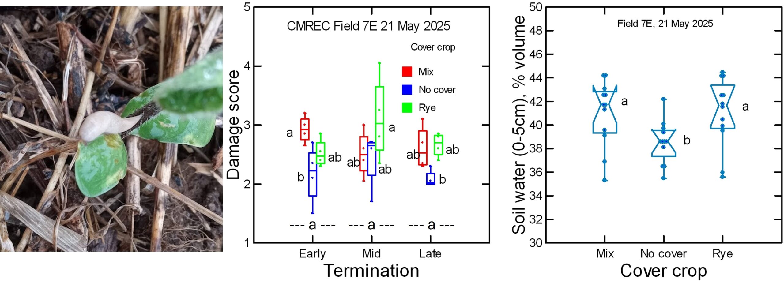 Unlike for corn in the adjacent field, later termination and planting green did not affect soybean stand population or slug damage at Lewis'' farm near Ridgley (Figure 6).