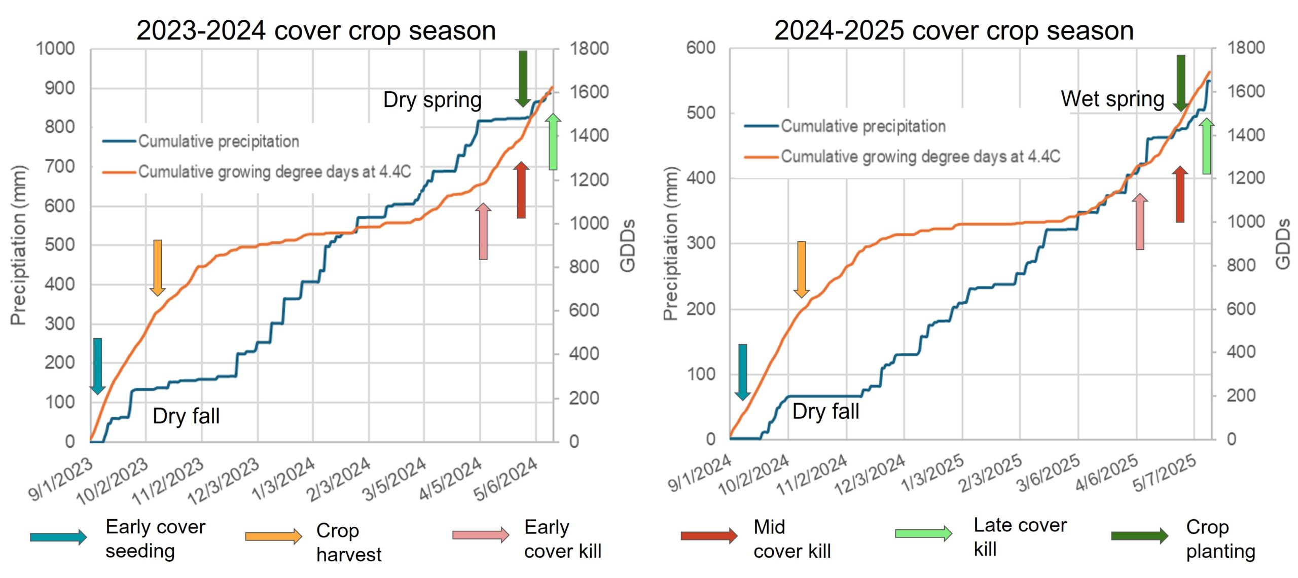 As can be seen from the precipitation and temperature data in Figure 21, the 2024-2025 cover crop season was much drier than the previous year's, but temperature patterns were quite consistent from year to year. The figure shows that the cumulative growing degree days (GDDs, based on a minimum temperature for cover crop growth of 40 °C) in 2024-2025 were almost identical to those of the previous year. The arrows in the figure indicate the timing of such operations as the interseeding of cover crops into standing crop canopies before harvest in fall, and the planting of cash crops into standing cover crops before the mid- and late-termination in spring. In both 2023 and 2024, conditions in the fall were quite dry with almost no rainfall in October. These dry fall conditions affected cover crop establishment from broadcast interseeding and limited their fall growth. Nonetheless, the graphs in Figure 21 also show that approximately 500 GDDs were gained by planting the cover crop seeds into standing crop canopies and not waiting to drill them after crop harvest. An additional 350 to 450 growing degree days were gained by delaying spring termination until planting or a week or so after planting.