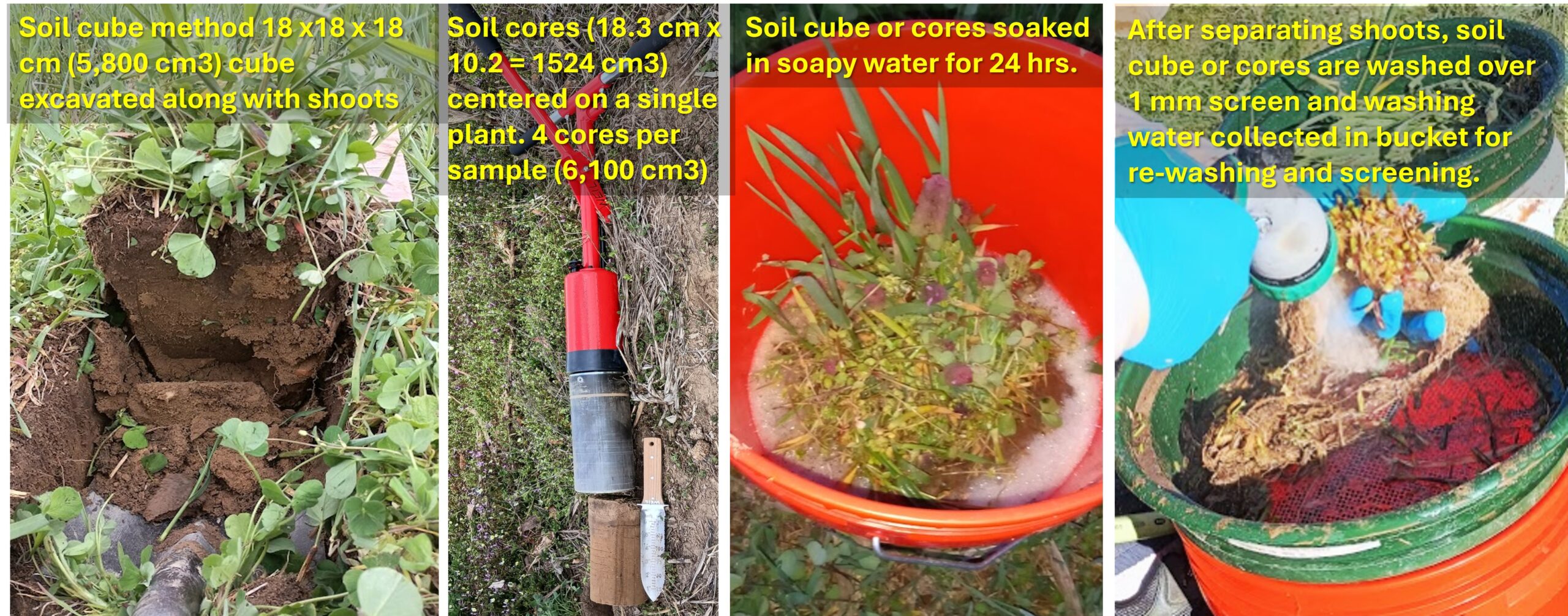 We used two different methods of sampling cover crop roots and calculating the root-to-shoot ratios (see Figure 23). In spring 2024, we sampled cover crop roots and shoots using the soil cube method, by which a cube of soil is excavated to a depth of 18 cm using a flat square spade. In the spring of 2025, we repurposed a large coring device originally designed to cut holes for golf course cups. This device obtained a core that was 20.3 cm deep and 10.2 cm in diameter. We obtained four such cores per sample, each core centered over an individual plant or clump of plants of either crimson clover or rye. One cube or four cores of soil and roots were soaked in soapy water for 24 hours to loosen the soil from the roots, and then washed under high pressure spray of water using screens and collecting the wash water in buckets. After washing, the roots and associated shoots from each sample were dried 65° C to a constant weight, and the dry weights were recorded. The dry root and shoot samples were ground through a 1 mm mesh for further analysis. The labor-intensive nature of this task probably accounts for why the literature has far less information about the below-ground parts of cover crops than the above-ground parts.