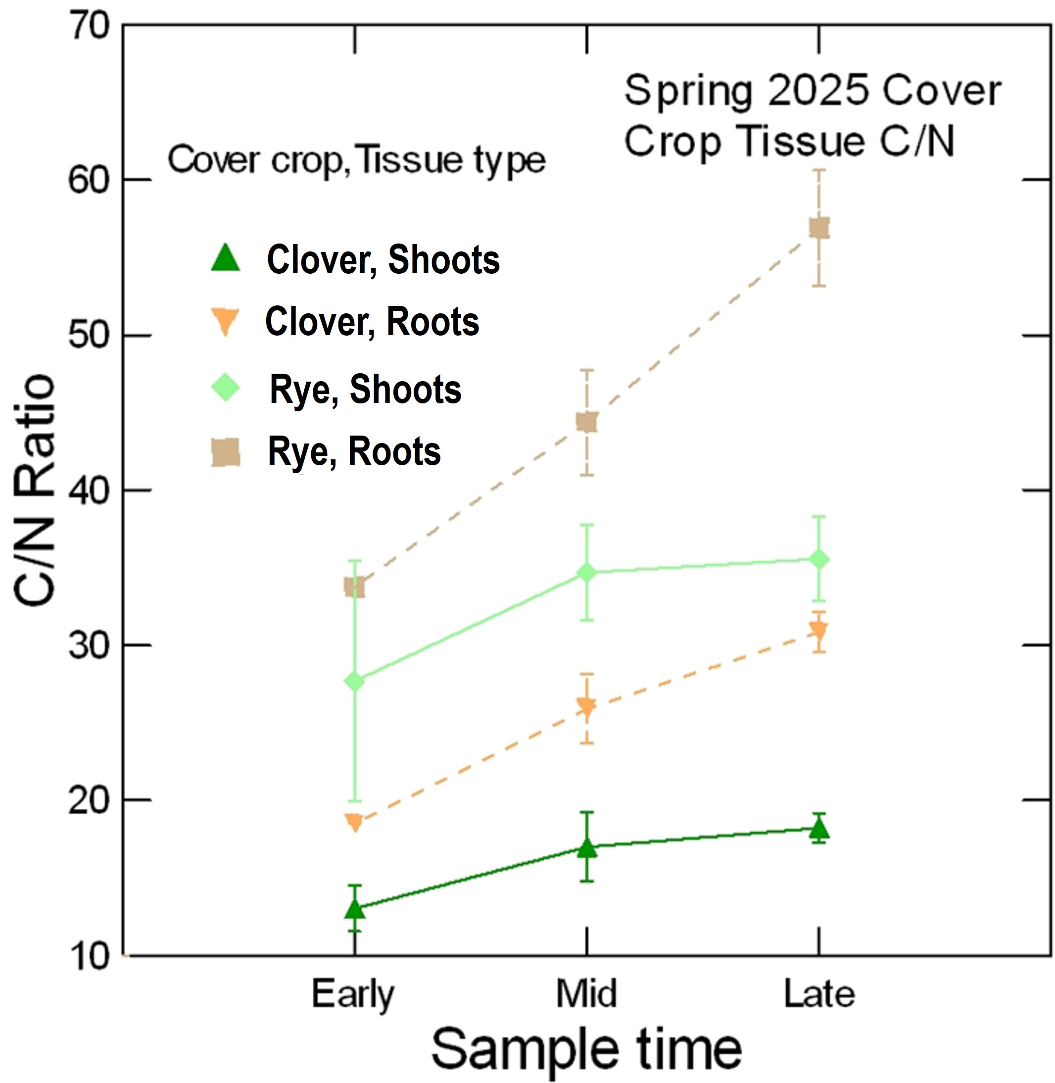 The much higher C/N ratios of the rye roots compared to shoots may help explain why rye cover crops are notorious for tying up nitrogen and reducing corn yields unless extra nitrogen is applied. The relatively high C/N ratios of even the clover roots may help explain why the amount of nitrogen that subsequent corn crops typically receive from legume cover crops is often quite disappointing relative to the total amount of nitrogen measured in legume cover crop shoots. Terminating legume cover crops by non-chemical means, such as roller crimping, requires that they be in the full flowering stage. It seems possible that the high C/N root tissue of even the legume cover crops, when allowed to grow to the flowering stage, may immobilize enough nitrogen to make a difference.