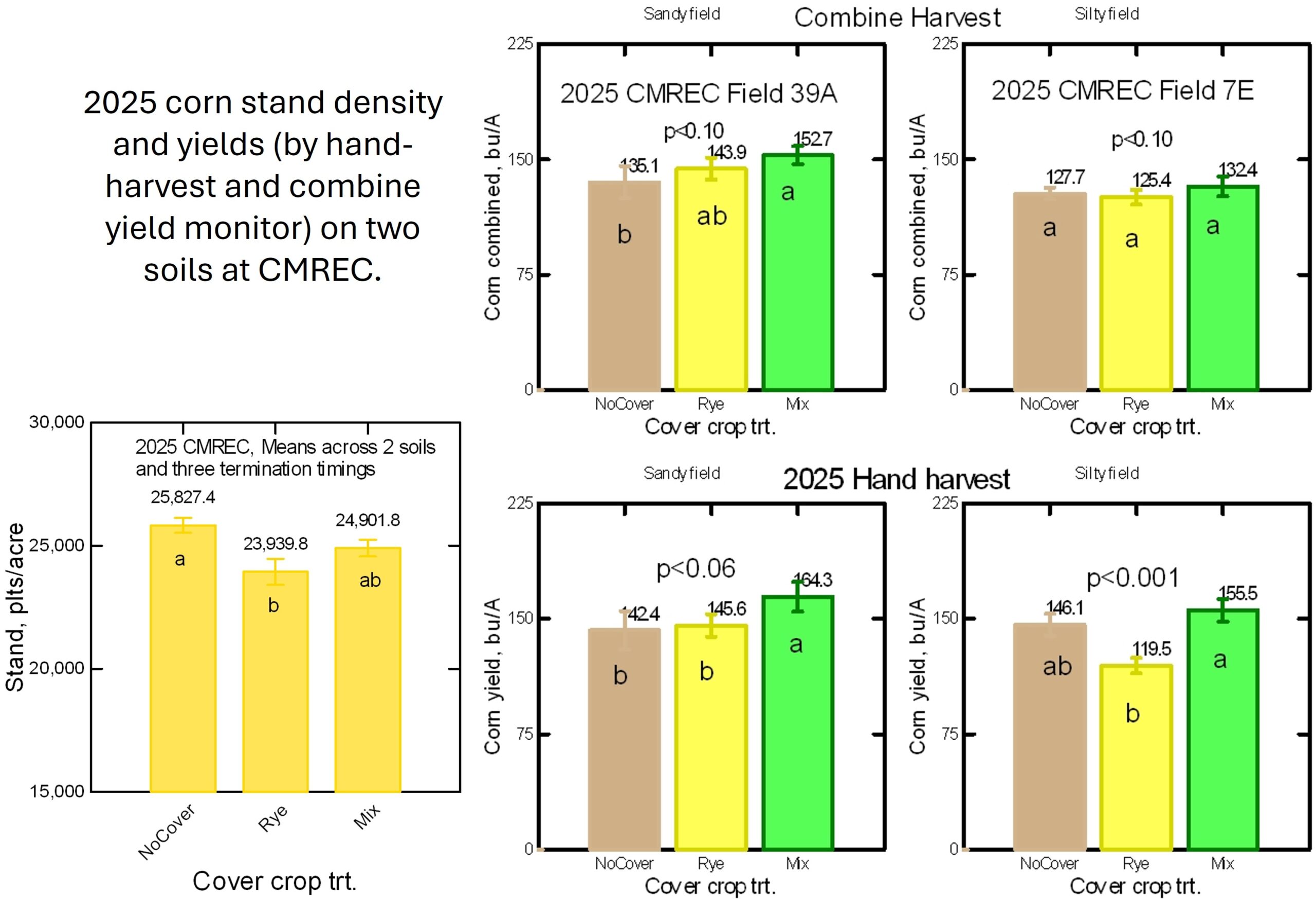 Across the two fields, corn stand density was significantly lower but still acceptable where rye was used as a cover crop compared to where there was no cover crop or the clover-rye-radish mixture was used (Figure 26, lower left). We measured corn grain yields using two methods: by hand-harvest of two 20-ft rows in the center of each termination date subplot, and by calibrated yield monitor during the combine machine harvest of the entire area of each termination date subplot. The results were similar and reasonably well correlated. The hand harvest values were slightly higher because the hand harvest avoided obvious anomalies like skips in the planting stand or groundhog mounds. The combine harvest yield in the sandy field was 153 bushels/acre in the mixed species cover crop plots, which was significantly higher than the 135 bushels/acre recorded for the no cover plots. At the silty field, yields were slightly lower, and there were no cover crop effects on the combine harvest yield data. At the sandy field, the hand harvest gave a similar pattern with higher yields in the mixed cover crop plots than in the no cover controls. However, in the silty field, the rye cover crop plots had significantly lower hand-harvested corn yields than the mixed species cover-cropped plots. The higher yields in the mixed species cover crop plots were probably due to a combination of somewhat better stands achieved by planting into the living clover and the advantage of some nitrogen provided by that legume cover crop. By either method of measuring corn yields, we detected no significant differences among the termination treatments in 2025.