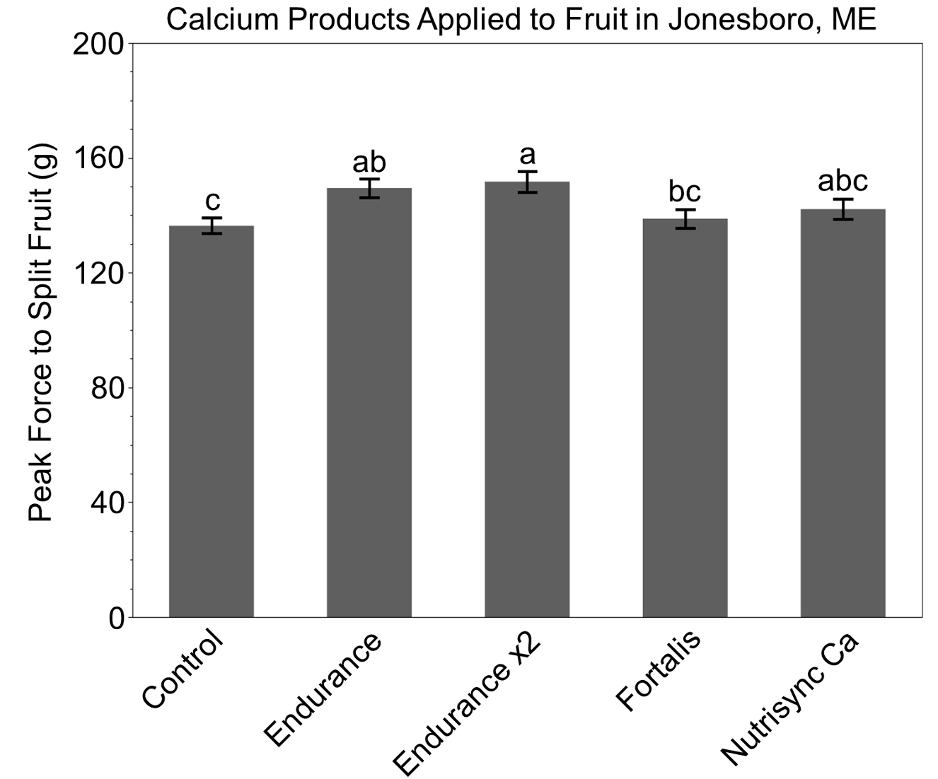 Endurance showed significantly firmer fruit compared to other products and the control when applied once and twice at the green fruit stage. When Endurance was applied twice, the fruit was firmer than when it was applied once. Endurance is the only foliar calcium product with calcium as the only active ingredient, with no nitrogen included in the formulation.