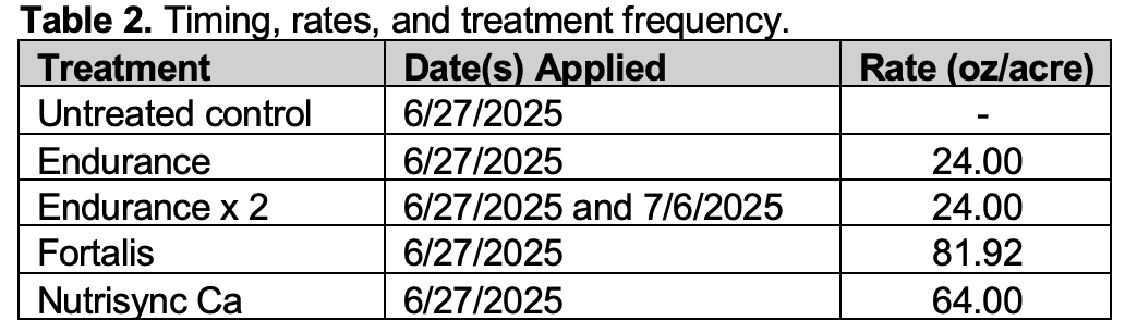 This study was established in 2025 in a lower field in the crop cycle at Blueberry Hill Farm in Jonesboro, ME. The design was a randomized complete block with five treatments (Tables 2 and 3) replicated six times with 30 x 10 foot plots for a total of 30 plots. The study space was sprayed for mummy berry and irrigated throughout the growing season to ensure delivery of 1 inch of water per week to the crop. Calcium products were applied at the green fruit stage, as shown in Image 1 on June 27th, and the second application of Endurance was applied 9 days later, on July 6th, when the fruit was slightly more mature. All products were applied with LI-700 (Loveland Products) at a rate of 2 pints per 100 gallons of spray mixture. Treatment rates were calculated from product label application information and from discussions with company representatives. All materials were applied in 25 gallons of water-mixture per acre with a CO2-propelled, 80-inch boom sprayer (76-inch swath) equipped with four, flat-spray, 8002VS TeeJet® nozzles operating at 30 psi and at a slow walking speed. Walking speed for each application was regulated using a metronome. The materials and rates are in Table 2, and the timing in Table 3.
