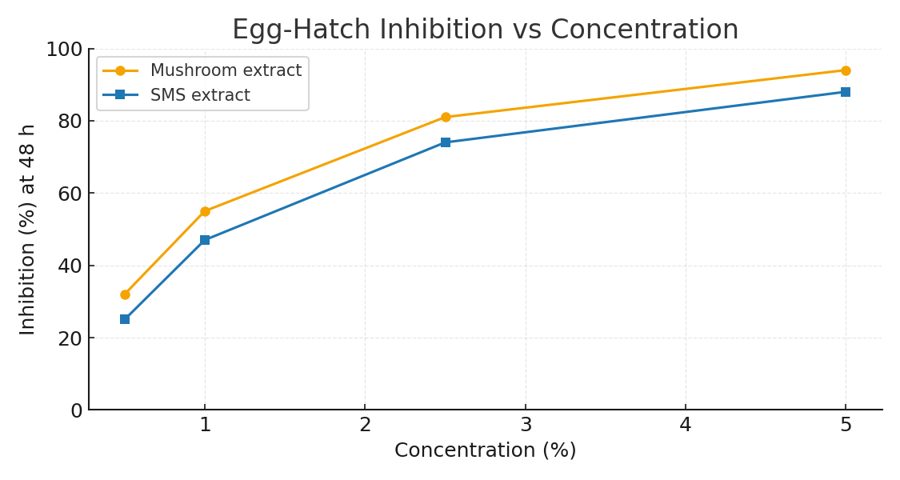 Materials and Methods: Mushroom fruit bodies and SMS were air-dried and extracted in water/ethanol. Serial concentrations (0.5–5%) were tested in vitro for egg-hatch inhibition at 48 h.