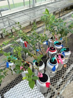 We planted grafted and own-rooted blueberry plants in these mesocosms. One year-old sparkleberry plants were side-grafted with scions of southern highbush blueberry cultivar ‘Sentinel’. One year-old ‘Sentinel’ plants were used as controls. ‘Sentinel’ is a new highbush blueberry variety that enjoys wide popularity among growers. Grower advisory board members Bert Sheffield and Kyle Straughn concurred with the cultivar selection.