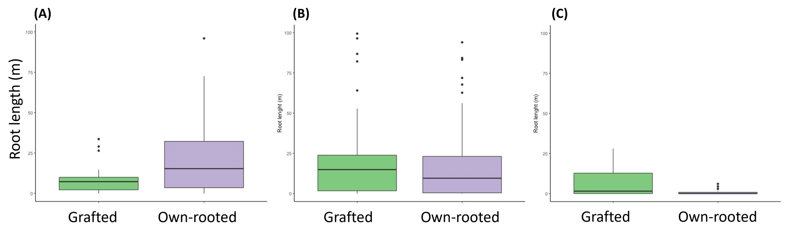 Edaphic and environmental conditions in the microcosms closely resembled blueberry farms and promoted vigorous plant growth. Own-rooted plants exhibited larger canopies than grafted plants (Figure 5A). This is consistent with the long establishment period of grafted plants in field conditions (Heller et al. 2023). Own-rooted plants also exhibited larger root systems (Figure 5B). However, there were notable differences in root distribution between grafted and own-rooted plants. Own-rooted plants exhibited higher root length than grafted plants in the first 22 cm of the soil profile (Figure 6A). There were no differences at depths between 22 cm and 44 cm (Figure 6B). Grafted plants exhibited higher root length than own-rooted plants at depths higher than 44 cm (Figure 6C). These results confirm field observations that suggested there could be contrasting root architecture between sparkleberry and blueberry (Lyrene 1997). Deeper roots in grafted plants might be an asset to promote reductions in irrigation and fertilizer use.