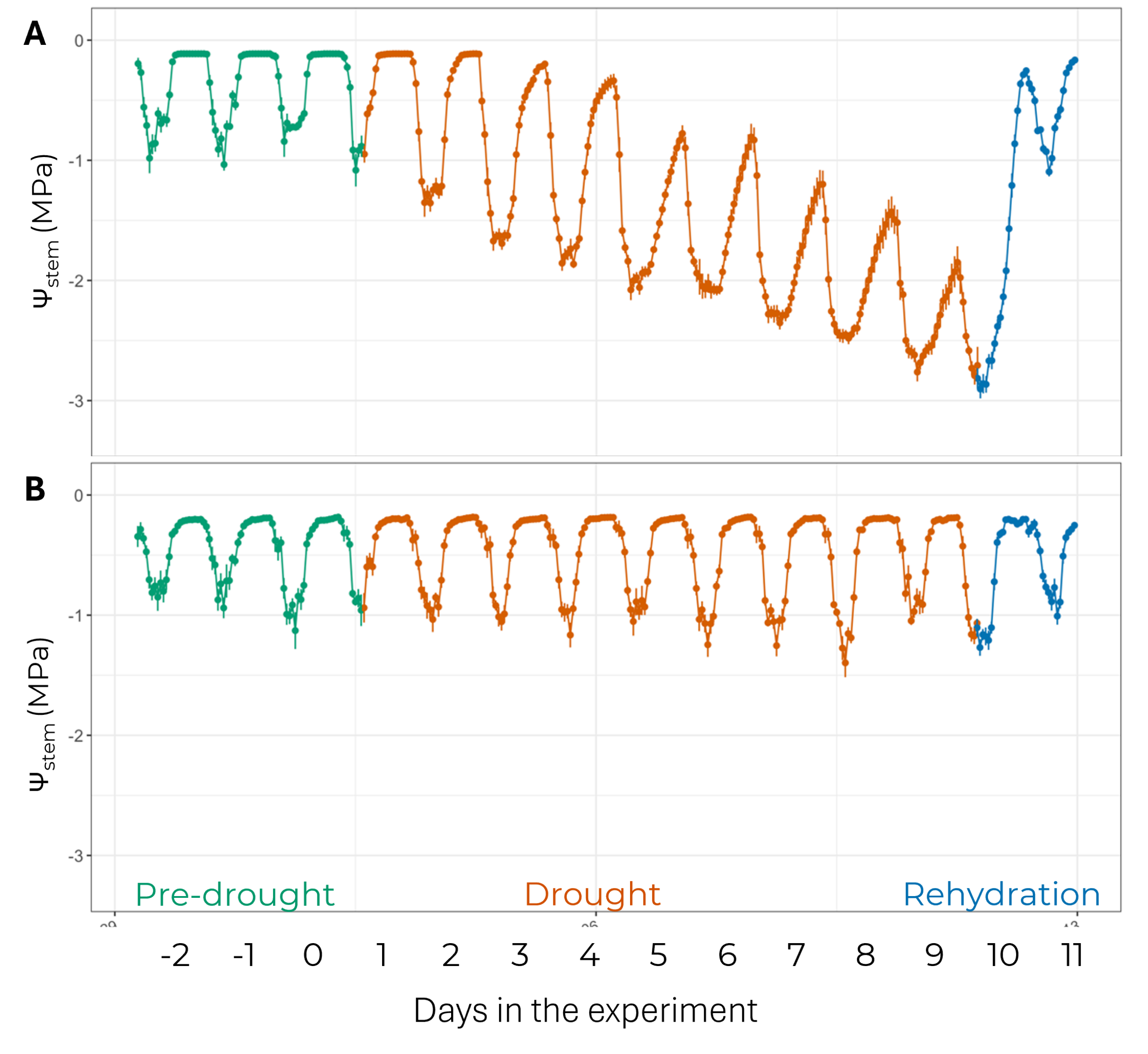 Stem water potential data helped put gas exchange results in context. Stem water potentials are negative magnitudes that measure the water status of the plant (the more negative a number the worse the hydration status of the plant). Midday stem water potentials of grafted plants were higher than those of own-rooted plants during the acclimation, water deficit, and rehydration periods. Grafted plants did not exhibit abnormal stem water potential patterns during the drought period (Figure 7). In contrast, own-rooted plants exhibited increasing drought stress symptoms. Altogether, these results indicate that grafted blueberry plants avoid water deficit stress -likely due to their deep root systems.