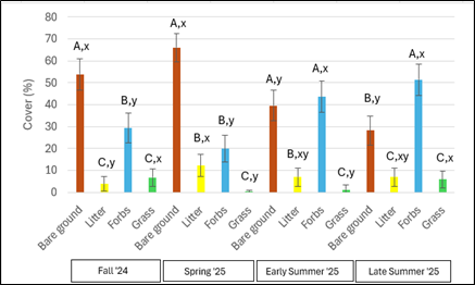 Trials were planted at Texas Tech’s Quaker Farm in Lubbock, Texas, in spring 2023 with four mixes (Table 1) in spring 2023. In late winter 2024, due to large-scale weed infestations in the plots at Quaker Farm, we decided we would re-plant plots at Texas Tech’s Native Rangeland in spring 2024. Plots were planted in a randomized complete block design at the Texas Tech Native Rangeland in Lubbock, Texas in May 2024. There were three blocks, and each mix was planted once per block. Individual plots were 8 ft wide and 33 ft long. The plots have received no supplemental water or fertilizer, and we have not applied any mechanical or chemical treatments to control volunteer vegetation since the plots were planted.