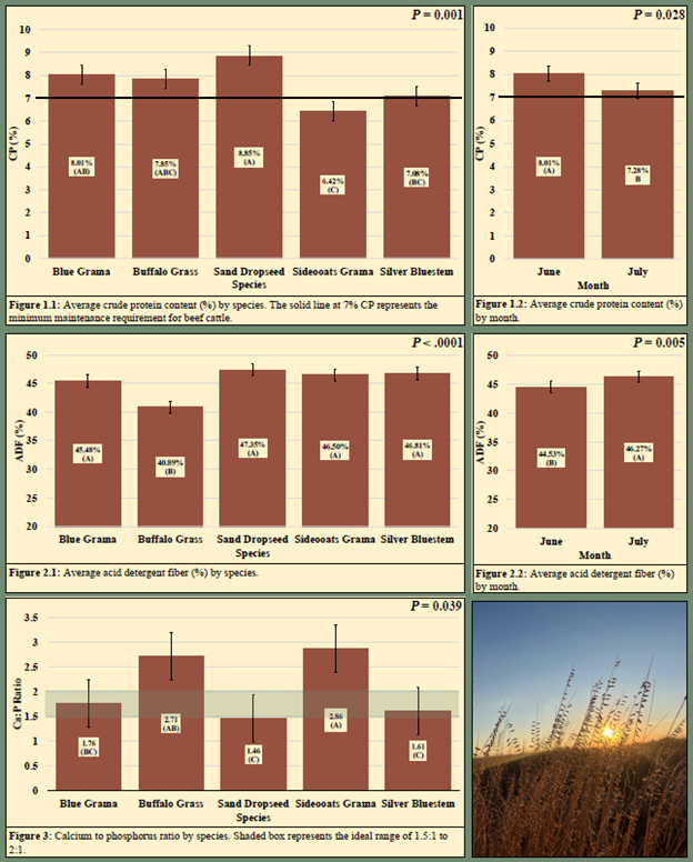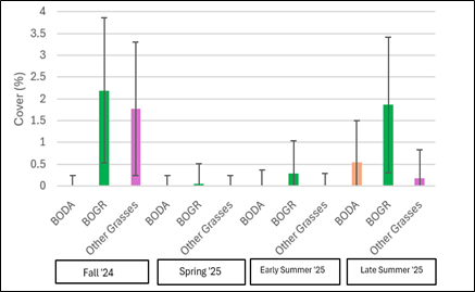 Native perennial forage trials at Lubbock, TX indicated that the ratio of grasses to forbs included in the mix had no main or interactive effect with any other variable. Cover % was influenced by the interaction of sampling date and cover type. Cover by volunteer forb species increased from fall 2024 to 2025, while bare ground decreased. No forbs that were included in the mixes germinated between fall 2024 – fall 2025. The primary volunteer forb species include kochia, Russian thistle, and bitter sneezeweed. Grass cover was also low (< 10%) at each sampling event. Of the three grass species included in the mixes (blue grama (BOGR), buffalograss (BODA), and western wheatgrass), two were recorded in the plots and both are increased in cover as the study progressed. Volunteer grass species included sandbur and windmill grass. Both of these species have decreased in cover since fall 2024. Perennial forage trials at San Angelo demonstrated similar inefficacy of seeding forbs with native grasses, and resulted in primarily side oats grama with sparse buffalograss and considerable broadleaf weed presence, regardless of treatment effects. Across multiple attempts in different years at both locations, establishment of native perennial forages on degraded cropland was very slow, challenged with weeds, and did not result in establishment of the majority of species planted. Forage nutritive value was largely poor, indicating that protein supplementation may be needed if exclusively grazing these forages.