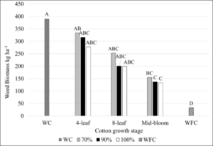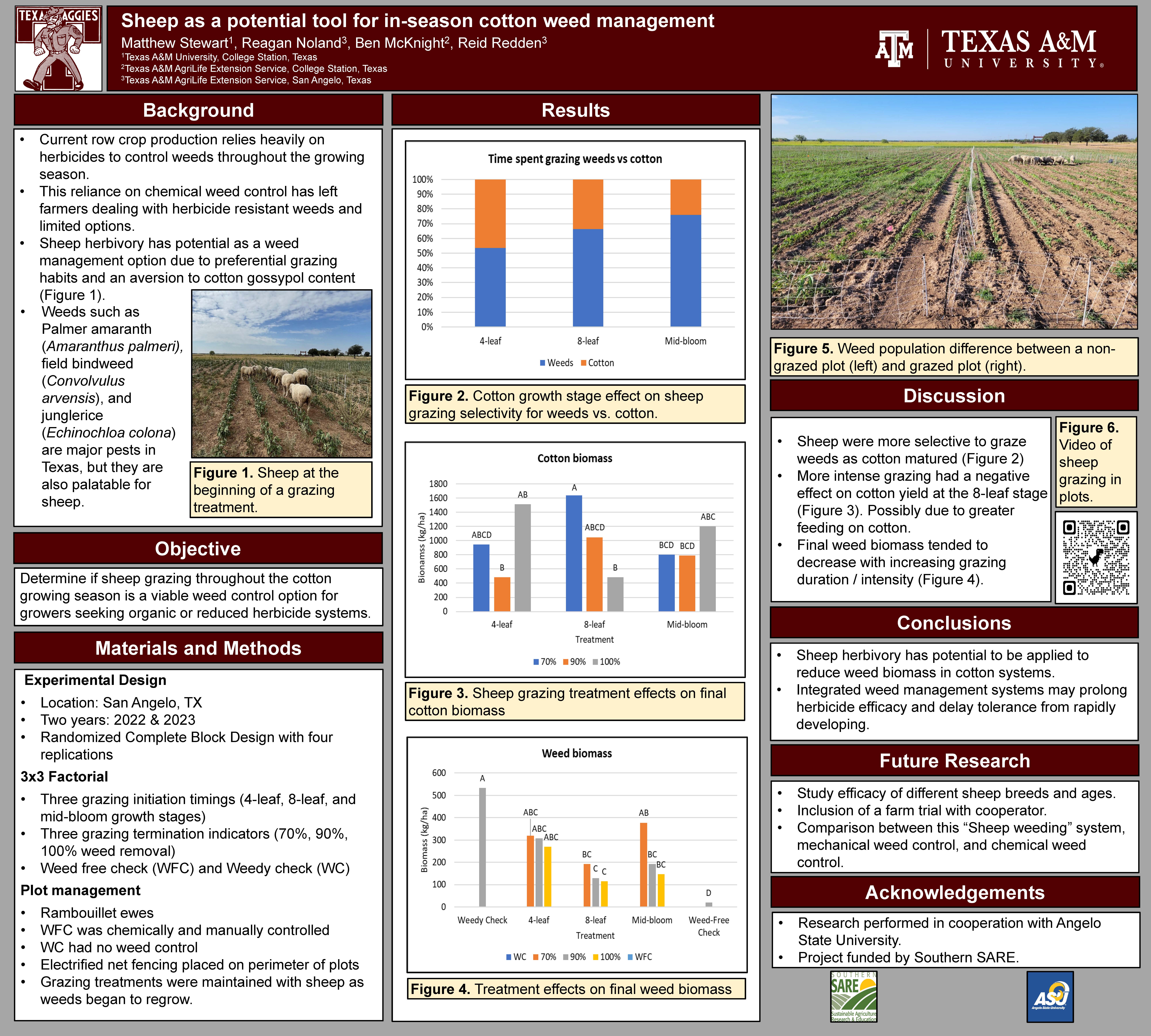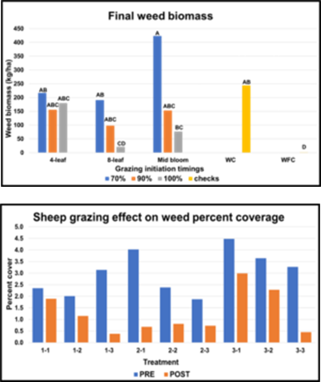 - Field experiments were conducted in San Angelo, Texas during the 2022 and 2023 cotton growing seasons at the Angelo State University Management, Instruction, and Research (MIR) center. A travelling irrigator was used persistently in response to the abnormally hot and dry growing seasons in both years, but both crop and weed growth were limited by the environmental conditions. Portable electrified net wire fencing was used to separate plots and contain sheep during grazing events. Electric net fencing also served as a barrier to help keep deer pressure down in the plots. The trial was designed as a 3×3 factorial with treatments including three different cotton growth stages to initiate grazing (4-leaf, 8-leaf, and mid-bloom) and three different levels of grazing intensity (approximately 70%, 90%, and 100% weed removal with presumably greater cotton damage with increasing intensity). Differences were identified using α = 0.1. Each replication also included a weedy-check and weed-free check. To maintain our weed free check (WFC), chemical control was used at the beginning of the season and then manually weeded throughout the season. Our weedy check (WC) had no control. The trial was arranged in a randomized complete block design with four replications. Before and after each grazing initiation, aerial imagery was collected with a UAV. This allowed quantifying weed biomass removal by sheep by analyzing weed canopy cover percentage before grazing and removal after grazing. In 2022, quadrat imagery and clippings were collected (three 0.67 m2 quadrats per plot) as another way to quantify weed biomass removal. Based on evaluation of 2022 physical clipping vs. aerial imagery data, the aerial imagery was determined to better represent treatment effects to whole plot areas, and was continued in 2023. During each grazing treatment, notes were taken every five minutes on the number of sheep grazing weeds, grazing cotton, and how many were idle in the plot. These numbers were converted to sheep grazing hours per hectare (SGH ha-1) to determine, in scalable units, a level of grazing intensity required to accomplish the same amount weed removal. In the first and second initiation timings, sheep were grazed in the plots two or one more time during the season for plot maintenance. To measure final cotton and weed biomass, all cotton plants were harvested from a 3-m length of two center rows per plot, and weed biomass was harvested from the same area, including the interrow space. Biomass was weighed fresh then subsampled (approx. 500 g) for dry matter determination.