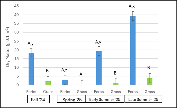 a. Test establishment success, forage yield and nutritive value, and soil health indicators across a range of forb inclusion rates with native perennial grasses.