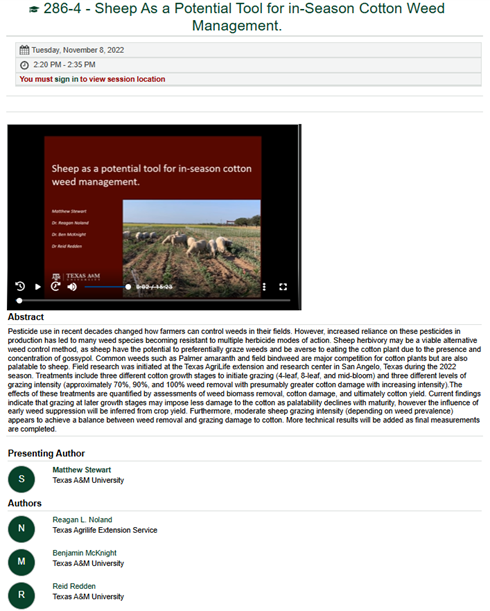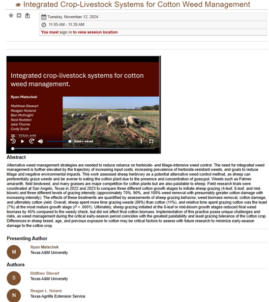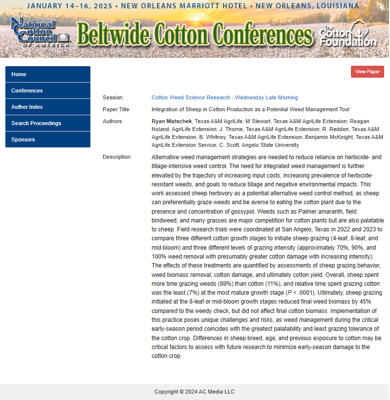 M.Sc. student Matthew Stewart began his research on this project in May 2022, coordinated both years of field research trials integrating sheep into cotton systems, and graduated in May 2024. Matthew shared his research findings at six different academic conferences (photos below): in an oral presentation at the American Society of Agronomy Meetings (Baltimore, MD) in 2022, and as a research poster at the Texas Plant Protection Conference (Bryan, TX 2022 and 2023), the Beltwide Cotton Conferences (New Orleans, LA in 2023 and Fort Worth, TX in 2024).