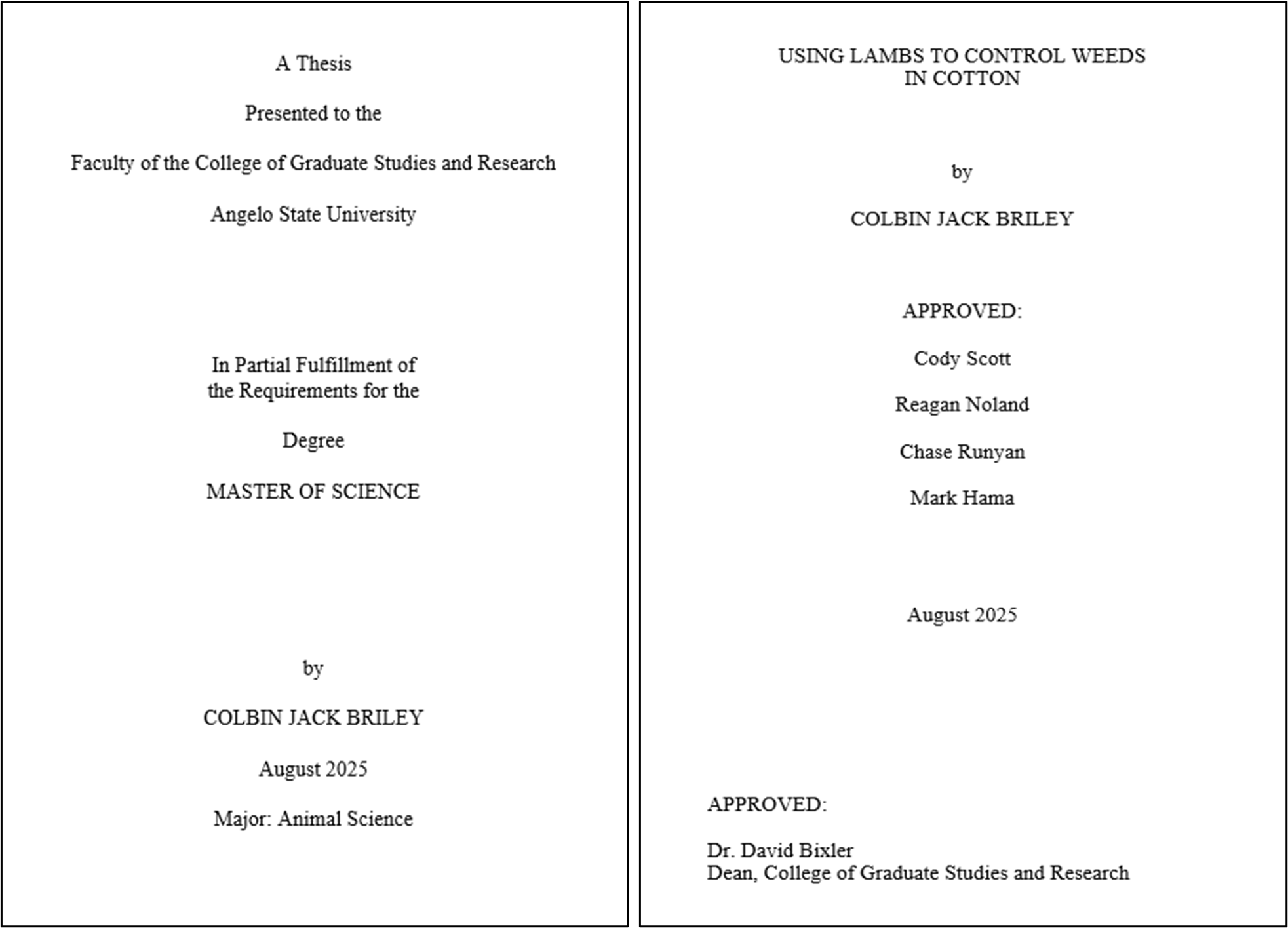 Thesis by Colbin Jack Briley submitted for partial fulfillment of the requirements for the degree of Master of Science and approved by Angelo State University.