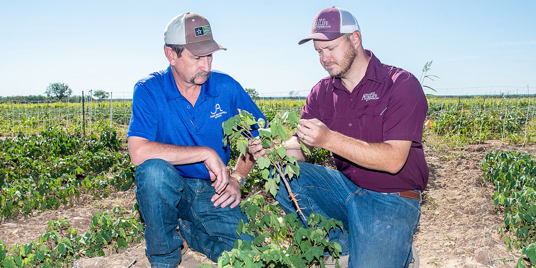 Dr. Reagan Noland (Texas A&M) and Dr. Cody Scott (ASU) (R-L) examine cotton crop after using sheep as natural weed control in summer 2022.