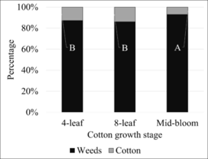 Trials assessing the effect of sheep grazing intensity and timing (cotton growth stage) indicated that sheep spent 87%, 86%, and 93% of feeding time grazing weeds rather than cotton with grazing initiated at the 4-leaf, 8-leaf, and mid-bloom stages, respectively. This supported the hypothesis that palatability of cotton declines with increasing maturity. Final cotton biomass was not influenced by year, intensity, or timing of sheep grazing treatments, but was greater when cotton was maintained weed-free without sheep. Final weed biomass was affected by year (P > 0.069) and timing of grazing (P > 0.036). Notably, grazing initiated at the 4-leaf stage resulted in greater weed biomass at the end of the growing season than grazing initiated at the 8-leaf stage. The key implication is that grazing too early imposed too much damage on the cotton, limiting the duration of the grazing event and lowering overall potential for weed removal.
