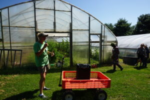 On 8/5/22 we hosted a day-long field day for beginning women farmers that focused on our networking/learning circle model and shared learning. The event, which kicked off the return of the full Soil Sisters weekend, attracted over 70 women, most beginning farmers and many their first agriculture event they attended. The event was held at Christensen Farm in Browntown, WI where host farmer, Katy Dickson, gave a detailed tour of her CSA organic vegetable operation including discussion on lifestyle issues such as integrating family and kids as well as her high tunnel funded through an NRCS EQIP grant.