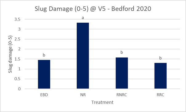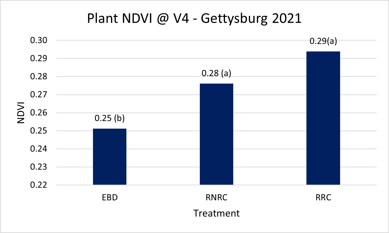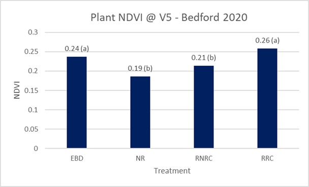 Bedford revealed differences in V4 population in 2021 as in 2020, with the no roll and rolled-no row cleaner having 13% lower populations than the early burndown and rolled-row cleaner treatments (α=.0077). There were no differences in plant height in 2021 (average 47 cm), although taking measurements one growth stage earlier may have affected those results. Similar to 2020, plant height standard deviation was impacted by treatment, with no-roll having a standard deviation of 8.1 cm compared to the 5.2 cm average deviation of the other treatments (α=.0004). Additionally, plant NDVI readings, were significantly lower in the no roll treatment, when compared to the early burndown and rolled-row cleaners treatment (α<.0001). Slug damage patterns were also similar in 2021, with the un-rolled treatment showing significantly higher slug damage, on average (α=.0016).
