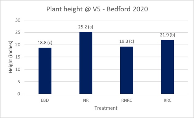 In addition to height differences, plants in the un-rolled area experienced greater slug damage on average, with visual ratings of damage double that of all other treatments a the Bedford location in 2020. Plant NDVI readings, as recorded with the Greenseeker, were significantly lower in the no roll treatment, when compared to the early burndown and rolled with row cleaners treatment (α=.007). The number of harvestable ears per acre in the un-rolled treatment was significantly lower than that of the early burndown treatment as well, with the early burndown having over 3,000 more ears per acre at harvest (α=.05). Interestingly, the ratio of harvestable ears per acre to the V5 plant population was between 0.97 to 0.99 for the early burndown, rolled-row cleaners and rolled-no row cleaners, while for the un-rolled treatment the ratio was 0.91. This suggests that a higher rate of plant mortality or reduced ear development occurred in the un-rolled cover. There was no difference in yield between treatments at the Bedford (average 176 bu/A), but the early burndown treatment did trend higher and the no-roll treatment lower than the rolled planted green treatments. Selected data from the Bedford site is shown below.