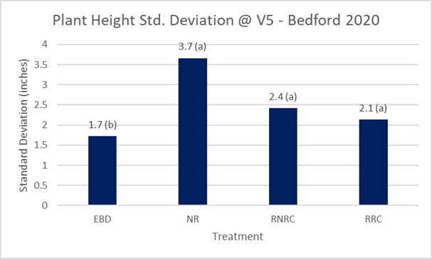 At the Bedford site corn population was 10% lower in the no-roll treatment (29,463 plants/A) than the other treatments (average 32,591 plants/Acre, α=.0948). Plants were taller at V5 for those in the un-rolled cover, being on average 3.3 and 6.4 inches taller than those in the rolled row-cleaner and early burndown treatments, respectively, as hypothesized (α<.0001). Plant height standard deviation was greater in the un-rolled cover as well, approximately 2 inches greater than the deviation found in the early burndown treatment (α=.0003) Physical differences between the plants were present as well, with those in the un-rolled cover having a much longer, but narrower leaf surface with less plant rigidity, resulting in a more "spindly" appearance. It appears that the plants are dedicating all carbohydrate reserves to putting on plant height to escape the shading of the cover, at the possible expense of stalk and root development.