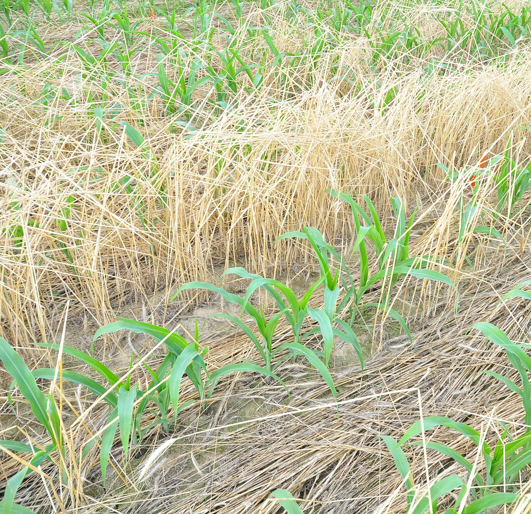 While the roller-crimper has been an effective tool for planting into standing cover crops (figure 2), the enthusiasm and promotion of the practice has led to many farmers attempting to plant green without utilizing a roller-crimper, instead planting corn directly into tall, dense cover crops. Much of this has occurred when planting green has been used as a ‘rescue’ when cover crops have not been terminated in a timely manner. Unfortunately, many farmers reported poor corn emergence when planting green into standing, un-rolled covers (figure 3) resulting in a negative opinion of the practice due to what may be poor execution of the concept.