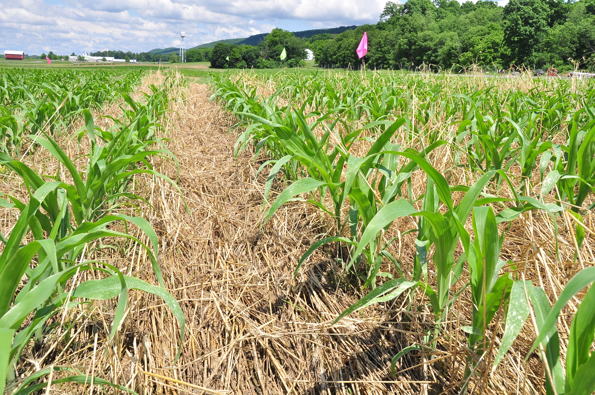This project explored how planting green into a standing, un-rolled cover crop impacted corn emergence and yield compared to rolling cover crops prior to planting, and row cleaner effects on corn emergence, slug damage and yield when planting green into rolled cover. The trial was replicated at two locations in 2020 and three locations in 2021 in central and southern Pennsylvania. Cereal rye cover crops were seeded at 45-90 bu/A in the fall the year prior to the study. Treatments consisted of early burndown, no roll, roll-row cleaners, and roll-no row cleaners. Corn population, height, slug feeding damage, and normalized difference vegetation index (NDVI) were measured around V4 and V8, and corn was taken to grain, with yield measured with a yield monitor. Not rolling the cover crop reduced corn population by an average of 12% in two of five site years. In the only two site-years where measurable slug damage was observed, not rolling covers increased slug damage ratings by 88-123% over the other treatments. Not rolling the cover crop increased corn height by 10 to 13 cm and increased height standard deviation by 2.9 to 4.0 cm over the other treatments two of five site-years; but, the effect reversed in one of five site-years, where no-roll was 13.6 cm shorter than early burndown. Early burndown or roll-row cleaners had higher NDVI readings or was significantly "more green" than the other treatments across site-years. Yield was not impacted at any site-year in the study, but trended lower in the no-roll treatment.