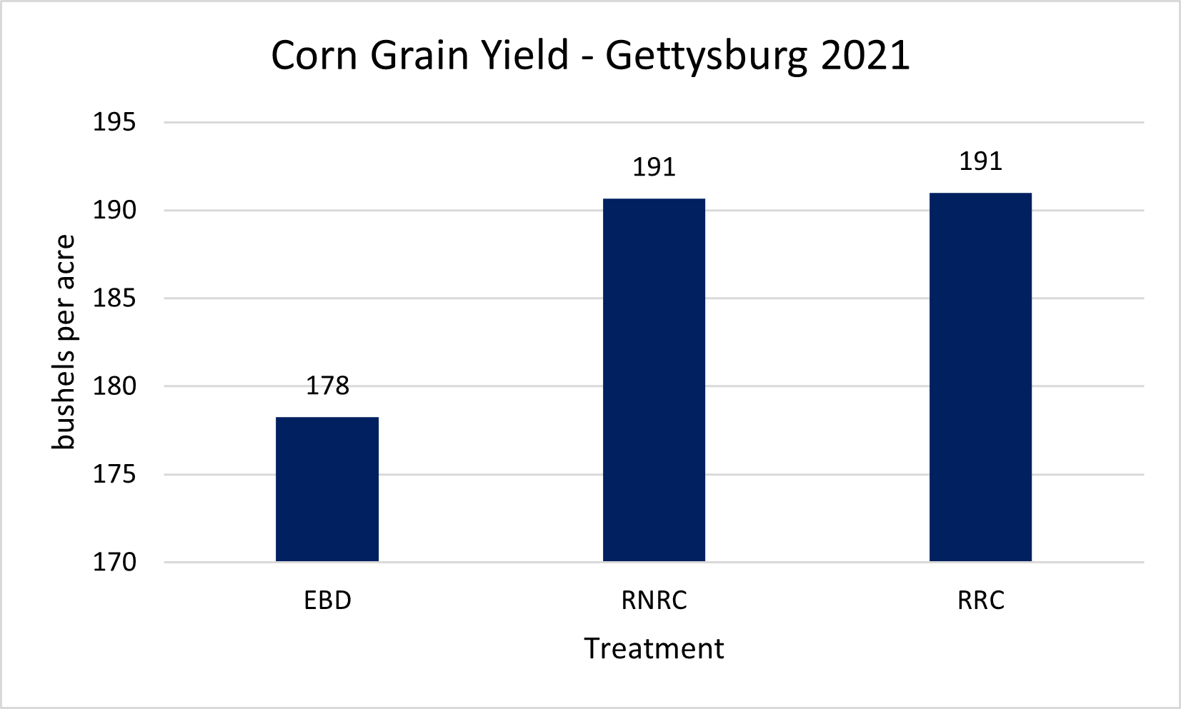 In 2021, due to cooperator error at the Gettysburg site, the site was arranged in a completely randomized design instead of randomized complete blocks.