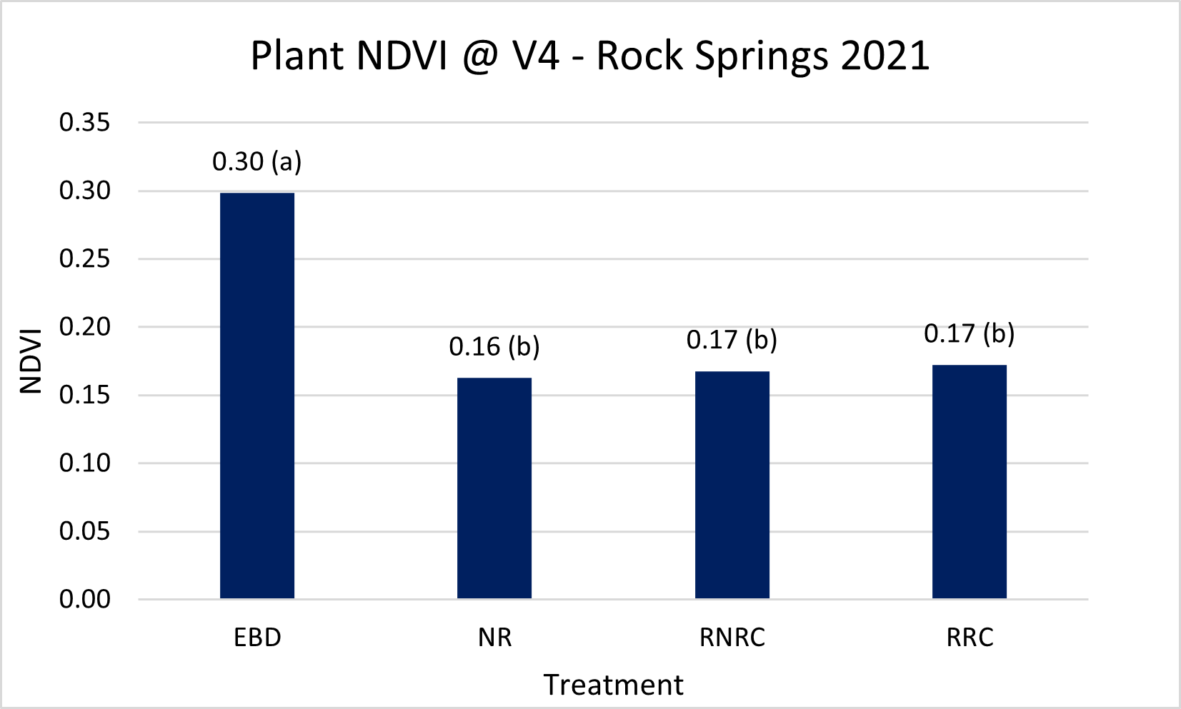 For the Rock Springs location a newly upgraded planter, equipped with many Precision Ag components, was used for 2021. Unfortunately, the high biomass cover lifted the row units such that adequate planting depth could not be achieved, and the planter sensing the shallow depth shut off the row units, drastically altering as-planted populations. However, this issue can be easily identified in the field as all four rows shut off at the same time, so measurements were not taken in those areas.