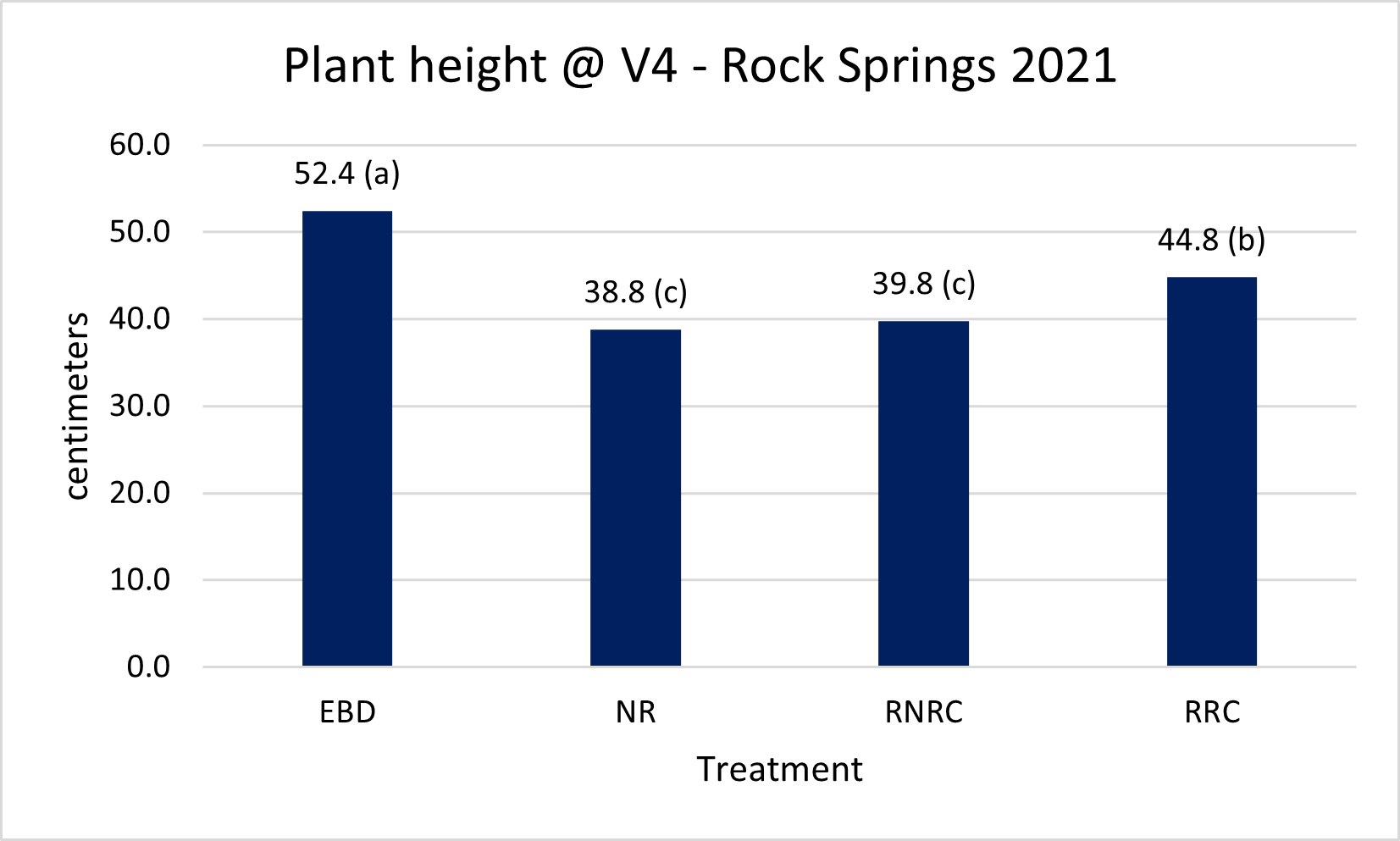 Similar to 2020, the 2021 Rock Springs research was performed on a site also hosting an herbicide study performed by Dr. John Wallace. Early termination plots were sprayed at late boot stage on 4/30 and planting occurred on 5/16. Measurements of plant height and population and Greenseeker readings were taken on 6/18 at stage V5. There was no observable slug damage at the Rock Springs site. Second Greenseeker measurements were taken at V7 on 6/29. Ear counts were recorded on 10/21 and harvest occurred in November 2021.