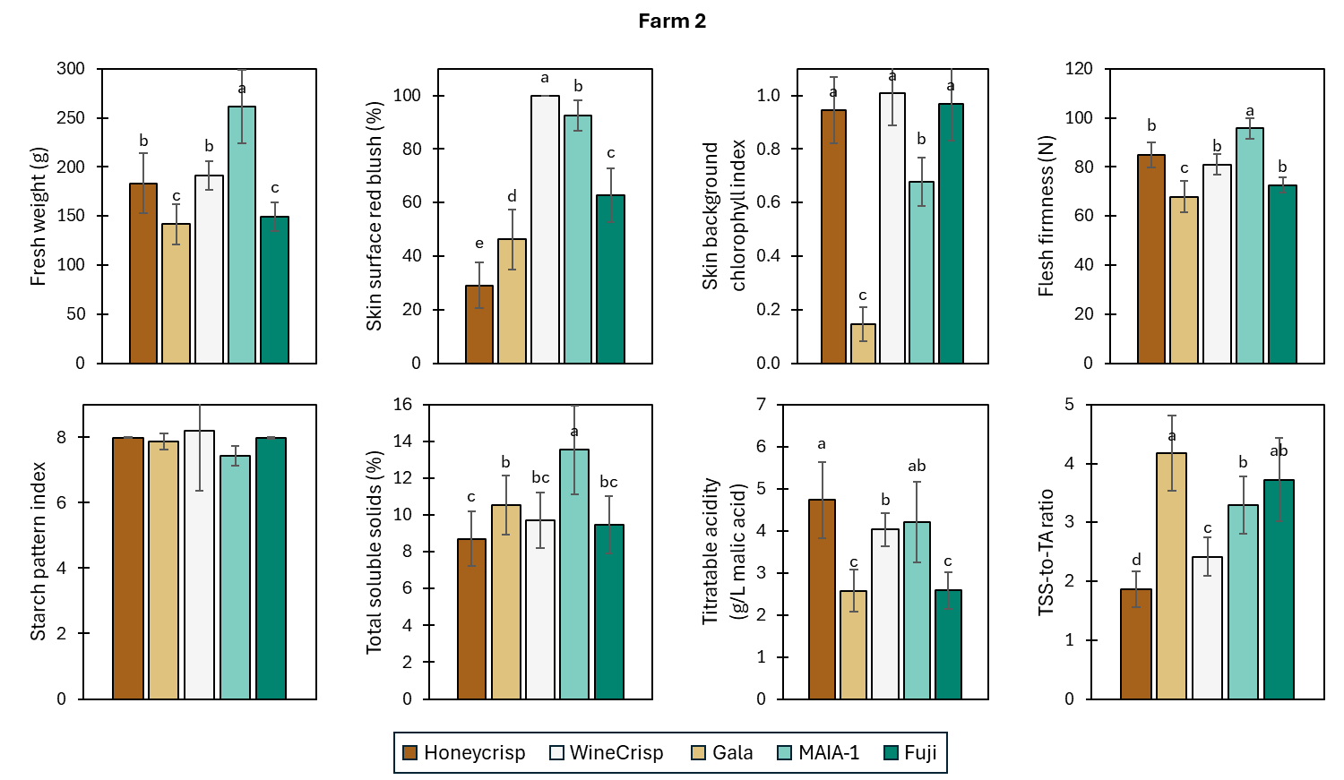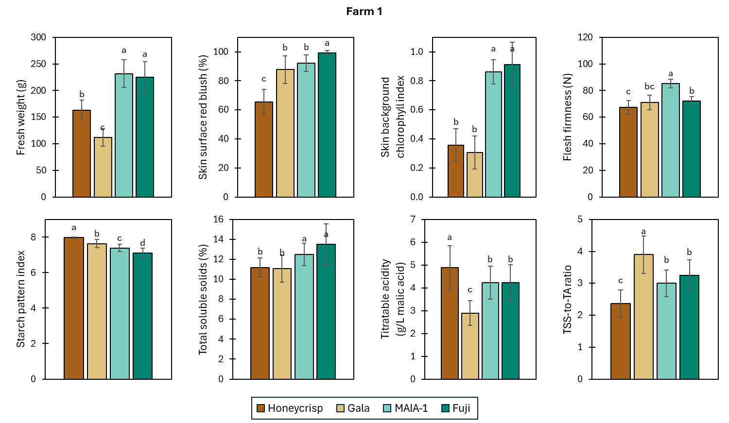 In 2024 (project year 1), the apple cultivars of interest, Honeycrisp, Gala, WineCrisp, MAIA-1, and Fuji, were harvested on August 9, August 23, October 4, October 18, and October 18, respectively; fruit samples were collected on the same day of commercial harvest. The fruit quality-related traits, including size (as fresh weight), skin surface and background colors, flesh firmness, and starch content, TSS, TA, TSS-to-TA ratio, varied among the cultivars within each farm. Overall, ‘Gala’ fruit were the smallest and ‘MAIA-1’ fruit were the largest in the group. The skin blush percentage of ‘Honeycrisp’ apple was significantly lower compared to other cultivars in both farms, indicating poor red coloration, which is one of the top issues of this cultivar in the mid-Atlantic region. Between the two farms, there was no consistent pattern across the apple cultivars for the index of chlorophyll in skin background color, flesh firmness, or starch pattern index, which are typically used in combination to determine the maturity of apple fruit. The index of chlorophyll in skin background color indicates the level of greenness on the fruit and is typically inversely correlated to fruit maturity. Based on this index, ‘Honeycrisp’ and ‘Gala’ were more ripen than ‘MAIA-1’ and ‘Fuji’ apple in Farm 1, but the maturity of ‘Honeycrisp’ was similar to that of ‘WineCrisp’, ‘MAIA-1’, and ‘Fuji’ in Farm 2. Despite the differences in fruit flesh firmness between cultivars, the values of all fruit obtained at the two locations were in the same recommended range for long-term storage (> 66.7 N, or 15 lb). The index of starch pattern corresponds to level of starch degradation in fruit, which occurs as fruit maturation progresses. Even though the apple cultivars exhibited differences in the starch content at Farm 1 and no difference at Farm 2, the values of starch pattern index of all fruit were greater than 7, a criterion recommended for fresh market apple.