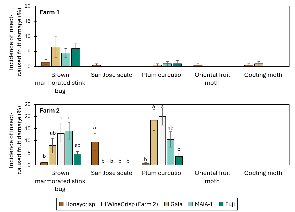 Northeastern apple growers typically have plantings of multiple cultivars in the same or nearby blocks within the same orchard to diversify and increase market opportunities. However, for these type of production systems, inherent differences among cultivars can result in difference in insect prevalence within an orchard, adding to the challenges for managing the pest complex while producing marketable apples. For example, following winter dormant pruning, differences in natural tree growing habits among apple scion cultivars contribute to variations in canopy density and microclimatic conditions, which likely influence insect phenology and their presence in apple orchards. In addition, fruit physiochemical properties associated with cultivars also play a role in insect host preference. In a preliminary study, we surveyed ‘CrimsonCrisp’, ‘Enterprise’, and ‘GoldRush’ apple on ‘Bud.9’ rootstocks within the same research block for insect damage at the USDA-ARS Appalachian Fruit Research Station (AFRS), Kearneysville, WV. Despite receiving the same insecticide program, fruit injury caused by BMSB, San Jose scale (SJS), PC, CM, and OFM, respectively, was significantly different among the three apple cultivars (Supplemental Materials). Our results reflect the difficulty in managing insect pests in orchards with multiple apple cultivars due to significant differences in how insects interact with them.