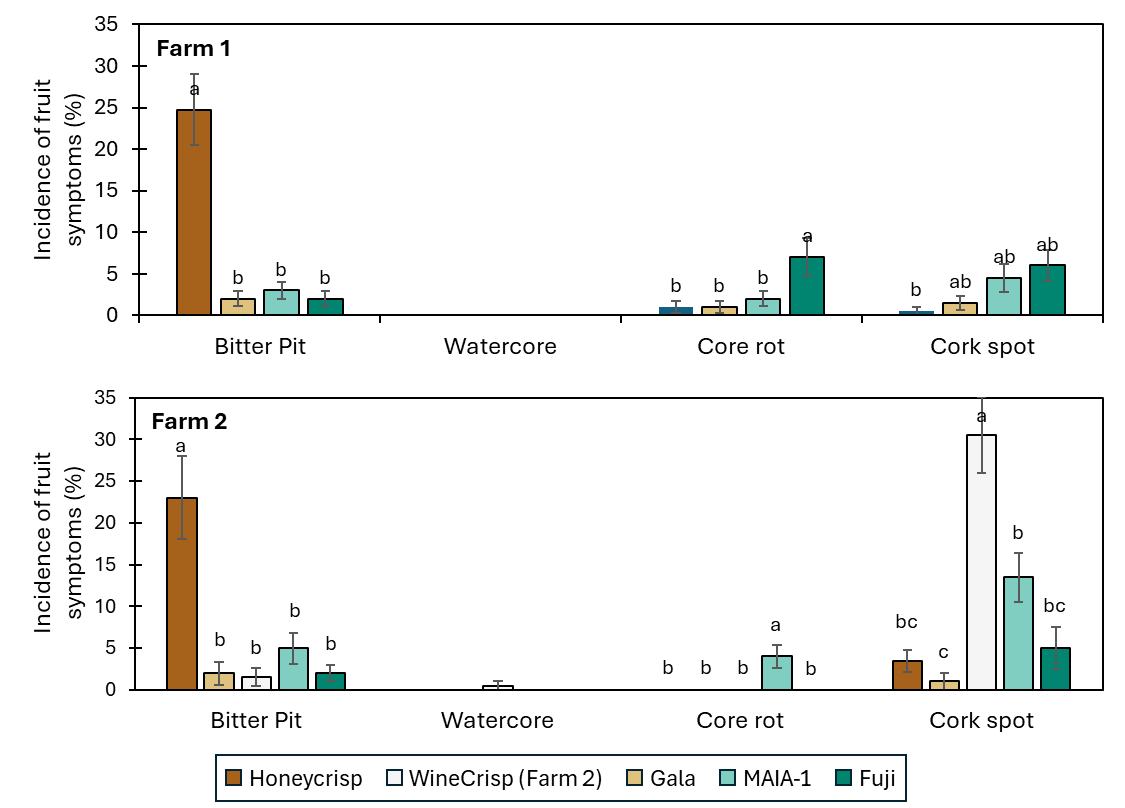 The results of our survey demonstrated that the incidence of bitter pit symptoms was the greatest in ‘Honeycrisp’ apple among the group at both farms. This is consistent with the consensus among apple growers and researchers that bitter pit is a common physiological disorder for ‘Honeycrisp’ apple due to the imbalance of calcium and potassium. Although a number of research reports have suggested that ‘Honeycrisp’ and ‘Fuji’ are susceptible to water core, we observed very low to no incidence of water core symptoms, such as water-soaked or translucent tissue in fruit, of all cultivars in either Farm 1 or 2. In general, all apple cultivars in Farm 1 had relatively low incidence of cork rot and cork spot symptoms (< 10%). Nevertheless, 31% ‘WineCrisp’ and 14% ‘MAIA-1’ apple displayed symptoms of cork spot, significantly greater than the rest of the cultivars in Farm 2. Between the two farms, the patterns of incidence of cork rot and cork spot symptoms, respectively, were not consistent across the apple cultivars.