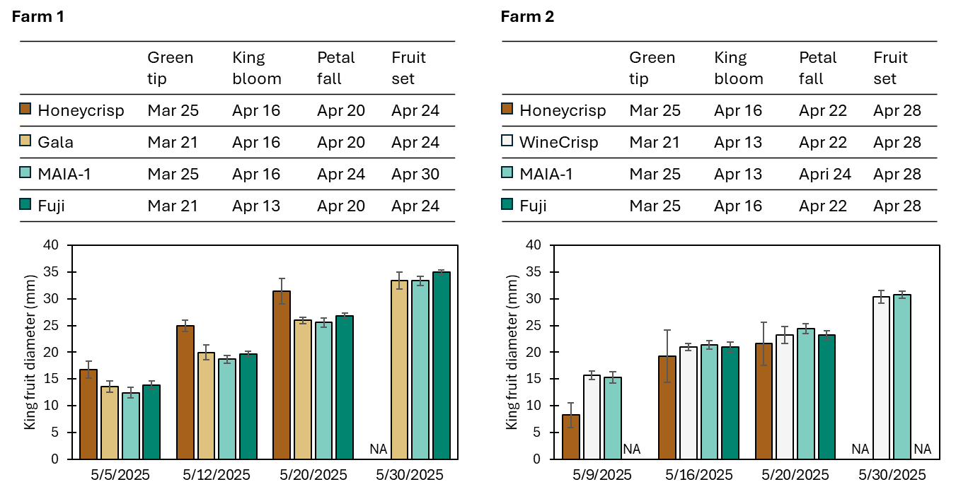 Starting in late March 2025, flowering phenology was tracked using five trees per cultivar of interest. Dates of key stages of apple flower bud development, including green tip, king bloom, petal fall, and initial fruit set, were documented during weekly inspections. To compare early fruit development (enlargement) among cultivars, transverse diameter of individual king fruit (15 fruit/tree; 5 trees/cultivar) was recorded weekly from the first to fourth week of May. However, there were fewer than 15 king fruit per tree for ‘Honeycrisp’ in Farm 1 and all cultivars except MAIA-1 in Farm 2 due to poor fruit set. In early June 2025, early season evaluations of insect damage to fruit were performed. For these assessments, 20 trees per cultivar were randomly selected at each farm; all four cultivars of interest were assessed at Farm 1 while only ‘MAIA-1’ and ‘WineCrisp’ were evaluated at Farm 2 due to poor fruit set in other cultivars. For each tree, 25 representative fruit were inspected on the tree for plum curculio injury (presence of oviposition scars and number of scars per fruit) and externally visible damage by internal worms (codling moth or oriental fruit moth). A total of 500 fruit per cultivar per farm were evaluated. Unexpectedly, abnormally low crop load was observed in trees of ‘Honeycrisp’ and ‘Fuji’ at both farms. Therefore, to avoid skewed data analysis, mature apple fruit were not sampled for the evaluation of quality-related traits, insect-caused injury, or physiological disorder symptoms in 2025 (project year 2). Fruit collection is projected to resume in summer/fall 2026.