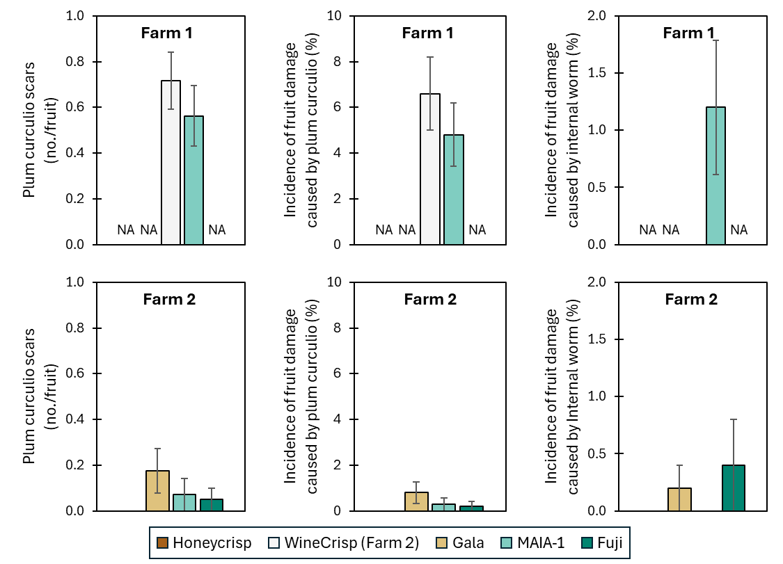 At Farm 1, no insect damage (plum curculio or internal worm) was recorded on ‘Honeycrisp’ fruit. ‘Gala’ had the highest plum curculio injury, and some low internal worm damage. ‘MAIA-1’ had low plum curculio injury and zero internal worm damage, and ‘Fuji’ had low percentages of both damage present. Farm 2 had overall higher incidence of plum curculio injury and internal worm damage than Farm 1, ‘MAIA-1’ and ‘WineCrisp’ both had 4.5 to 7% fruit injured by plum curculio, and ‘MAIA-1’ had an average of 1.2% of fruit with internal worm damage whereas ‘WineCrisp’ did not have any internal worm damage.