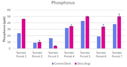 Phosphorus concentration (ppb) was measured at a Control Dock (n=1) and Silos (n=3) over seven sampling periods (June 13, 2025 – July 25, 2025). Blue bars represent the control dock measurement. Pink bars represent the average of three silo measurements. Data is presented as average + standard error (SE).