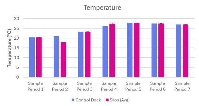 Temperature (°C) was measured at a Control Dock (n=1) and Silos (n=3) over seven sampling periods (June 13, 2025 – July 25, 2025). Blue bars represent the control dock measurement. Pink bars represent the average of three silo measurements. Data is presented as average + standard error (SE).