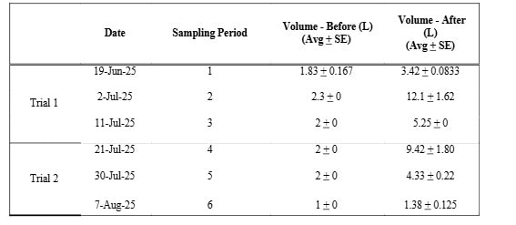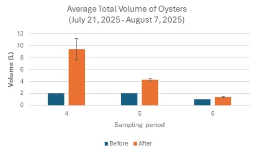 Table 3. Average total volume (L) of oysters measured from experimental silos at Oyster Ponds (June 19, 2025 – August 7, 2025). Both before and after volume (L) measurements are based on the average of three experimental silos. Sampling periods one through three indicate one experimental trial. Sampling periods four through six indicate one experimental trial.