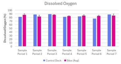 Dissolved oxygen concentration (%) was measured at a Control Dock (n=1) and Silos (n=3) over seven sampling periods (June 13, 2025 – July 25, 2025). Blue bars represent the control dock measurement. Pink bars represent the average of three silo measurements. Data is presented as average + standard error (SE).
