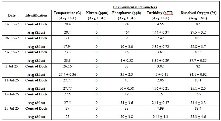 Table 2. Environmental parameters measured from the Control dock and Silos at Oyster Ponds (June 13, 2025 – July 25, 2025). Data with an asterisk (*) represents data that had limited sample readings. Control dock measurements were based on one sample, while silo measurements were based on the average of three samples.