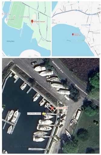 Safe Harbor Marina in Greenport, NY (top left panel); Oyster Ponds in Orient, NY (top right panel); and Safe Harbor Marina control dock and FLUPSY site (bottom panel). The control dock is designated by the yellow star, and the FLUPSY site is designated by the red star.
