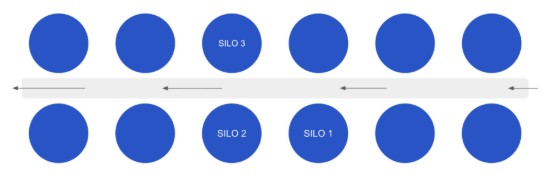 Schematic of the floating upweller system. The FLUPSY system consisted of multiple, vertical silos connected to a trunkline pipe that supplied continuous flow through seawater. Experimental silos were labeled with ribbon to be distinguished from other non-experimental silos. Silos remained attached to fixed positions on the trunkline to ensure consistency in water flow exposure across sampling periods.