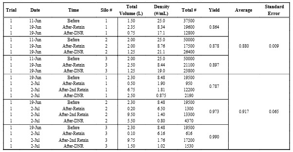 Table 4. Average percent yield of oysters in experimental silos during Trial 1 (June 11, 2025 – July 2, 2025)